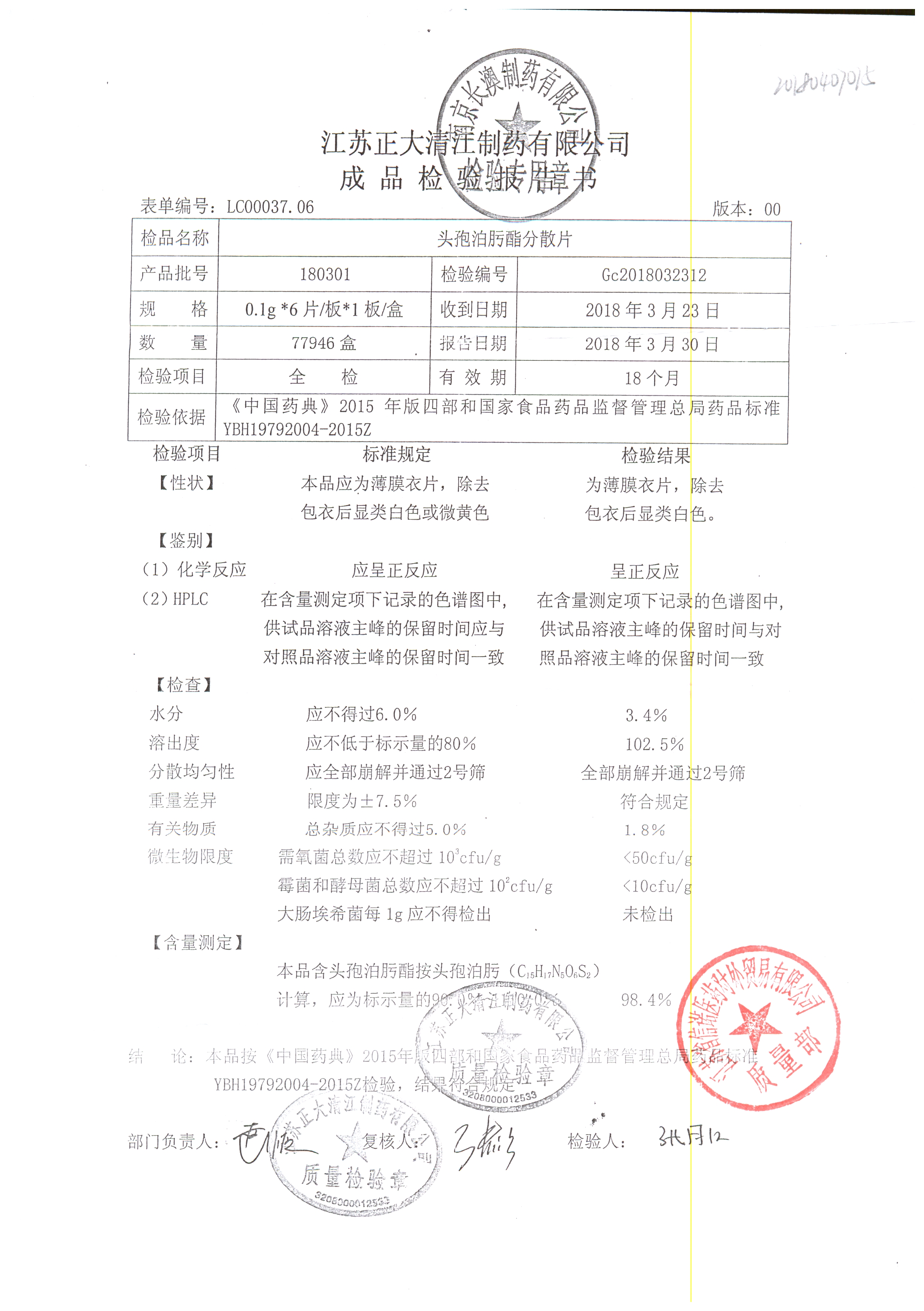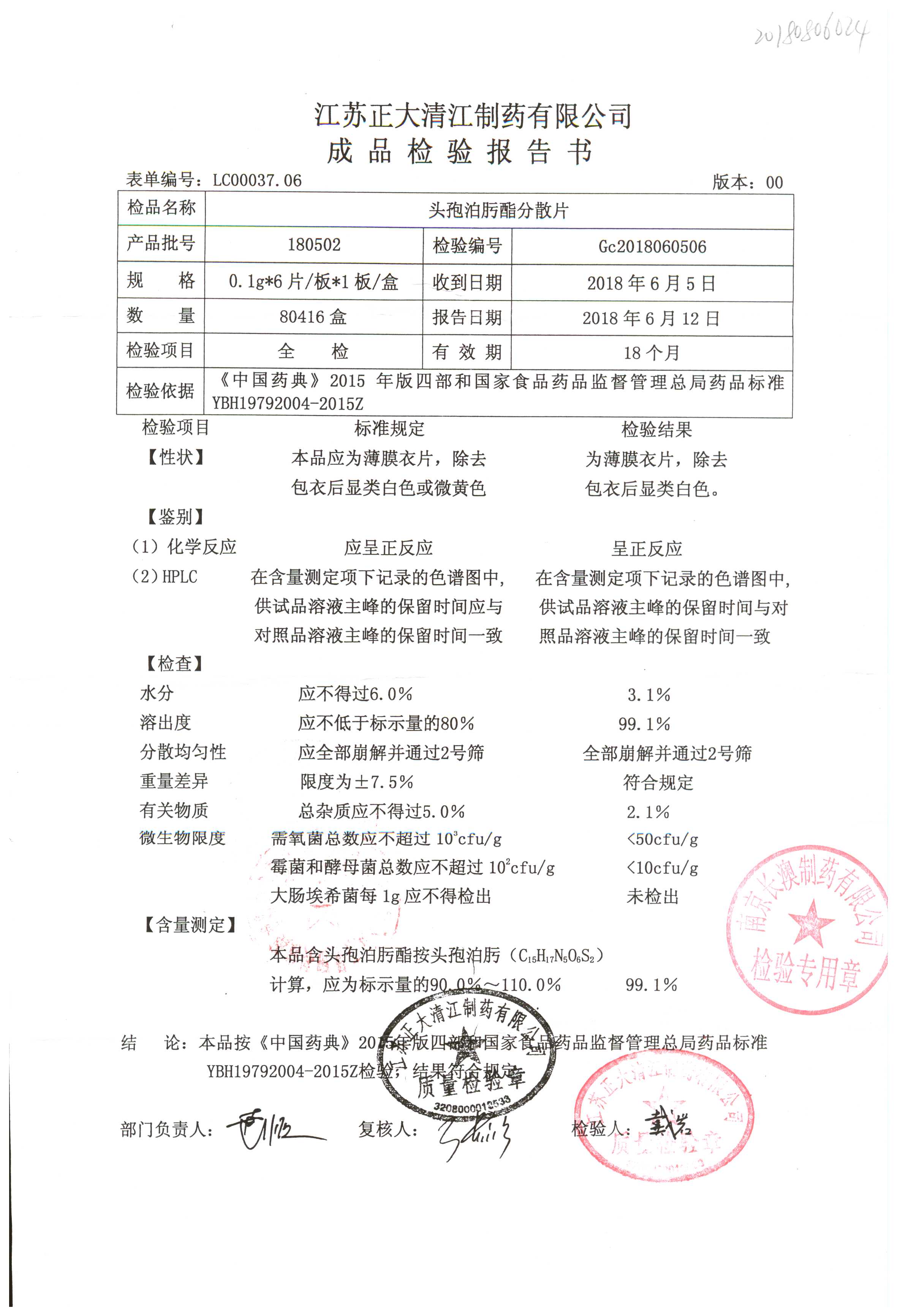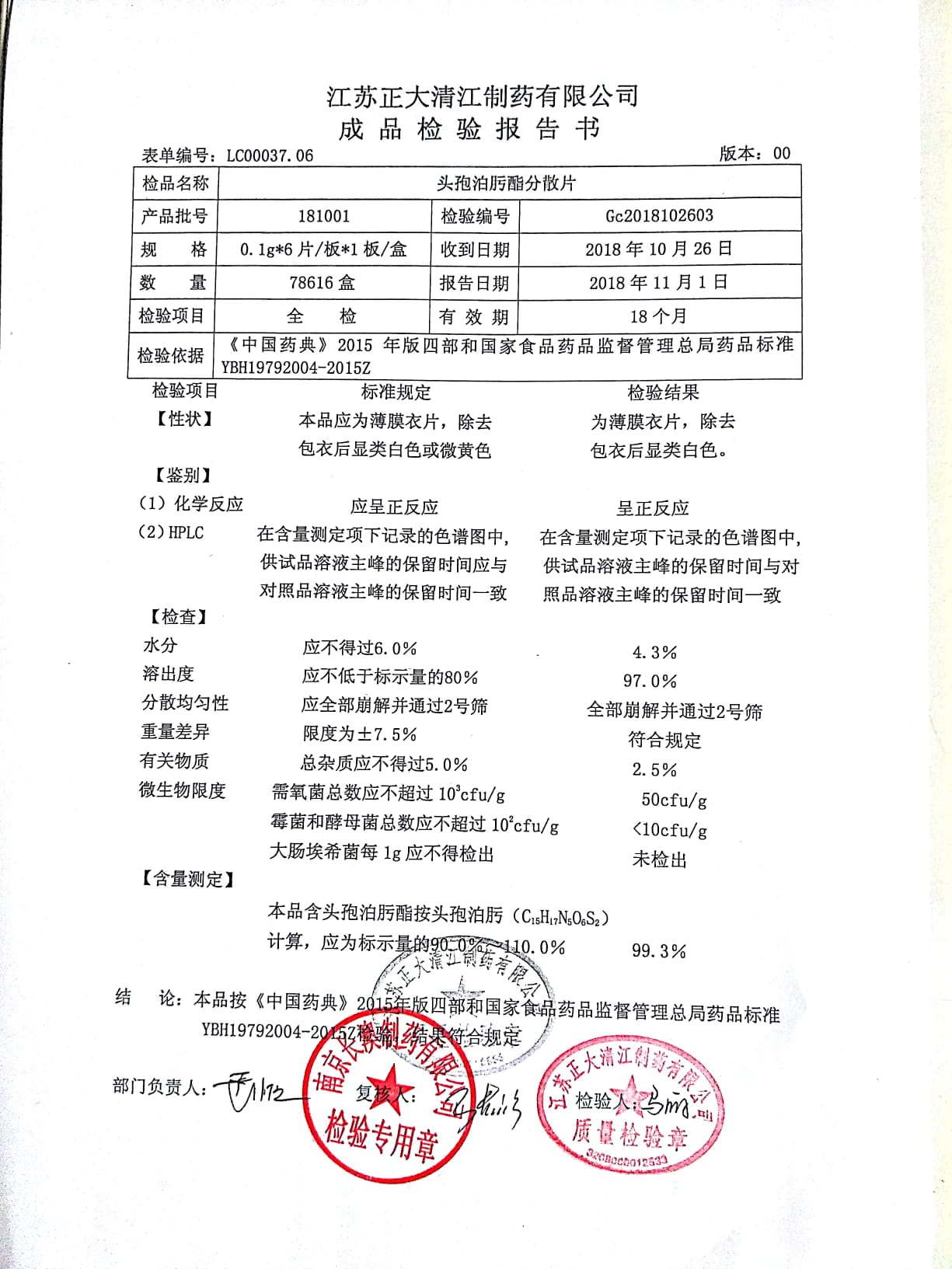 頭孢泊肟酯分散片 | 0.1g*6s | 190804 | 查看詳情 |