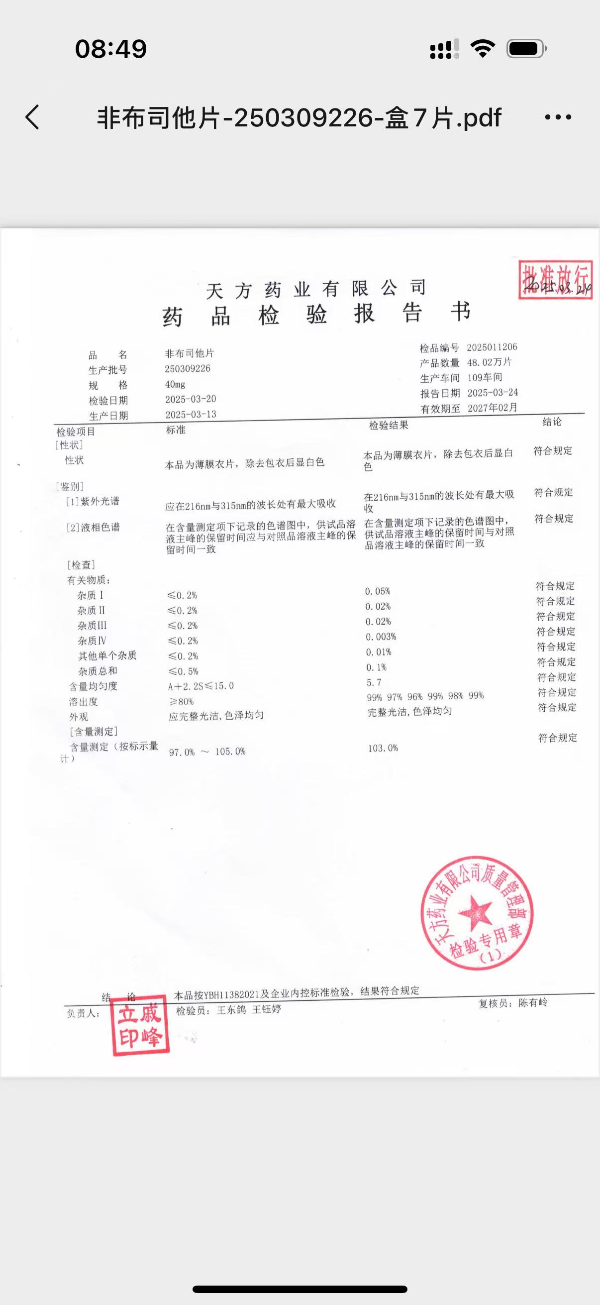 | 非布司他片 | 40mg | 250309226 | 查看詳情 |