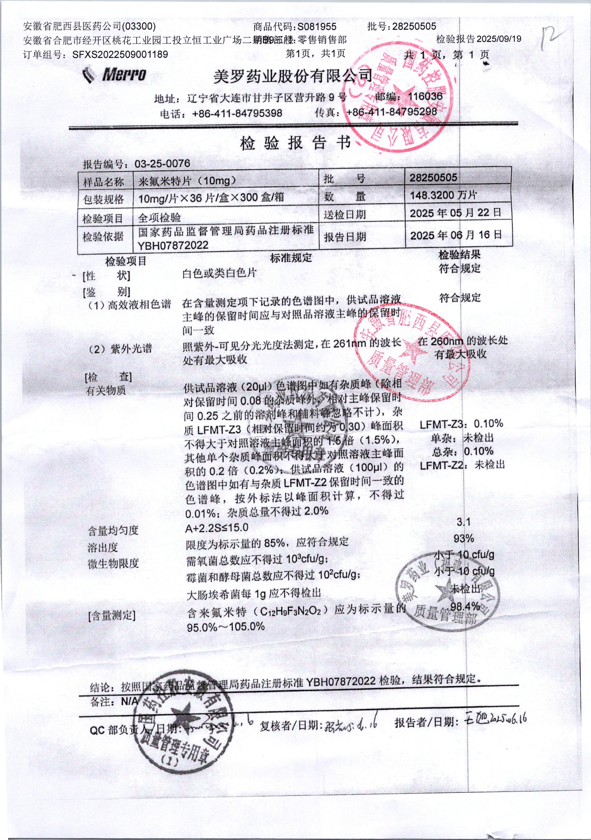 米氟米特片 | 10ml*36片 | 28250505 | 查看詳情 |