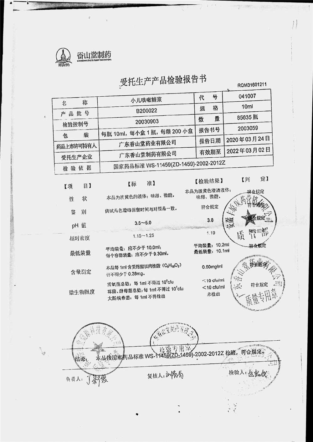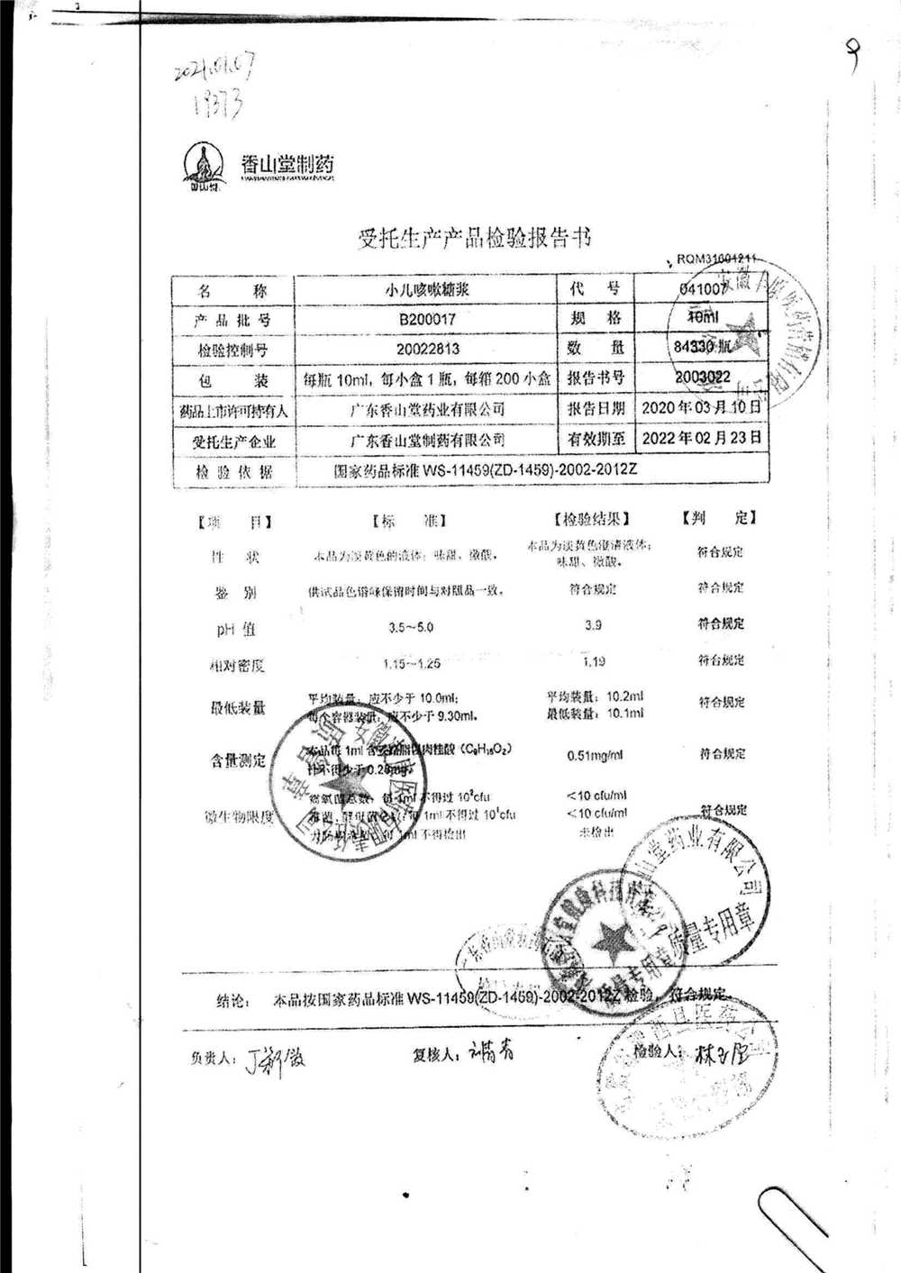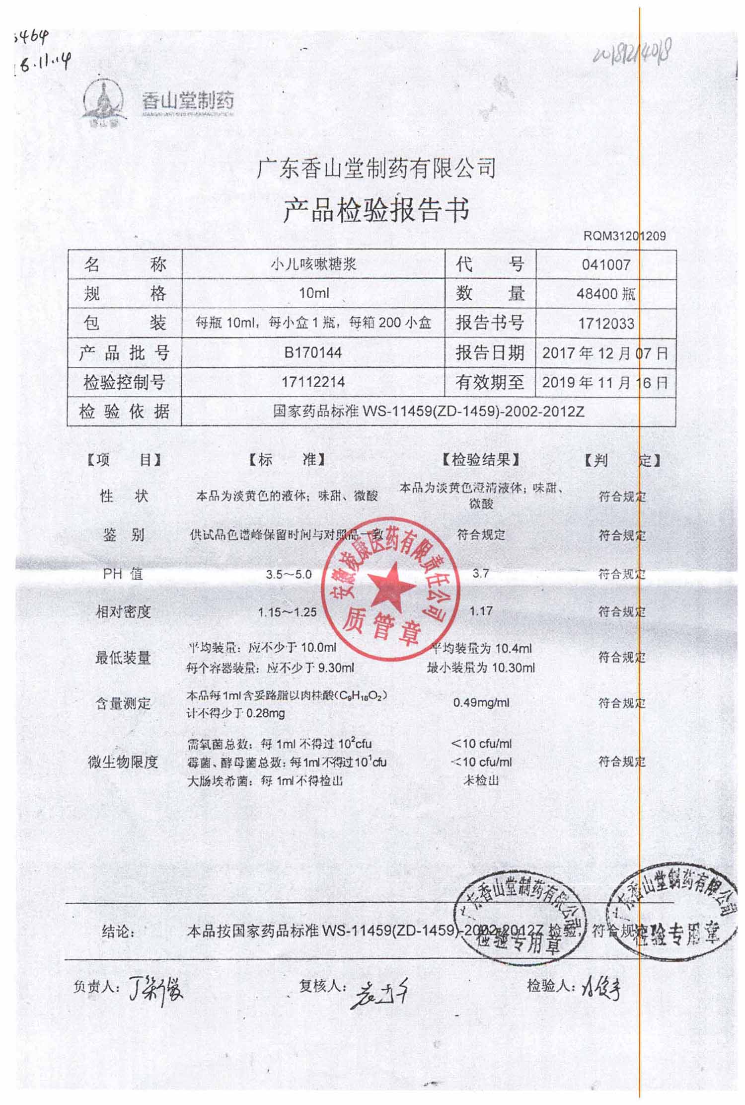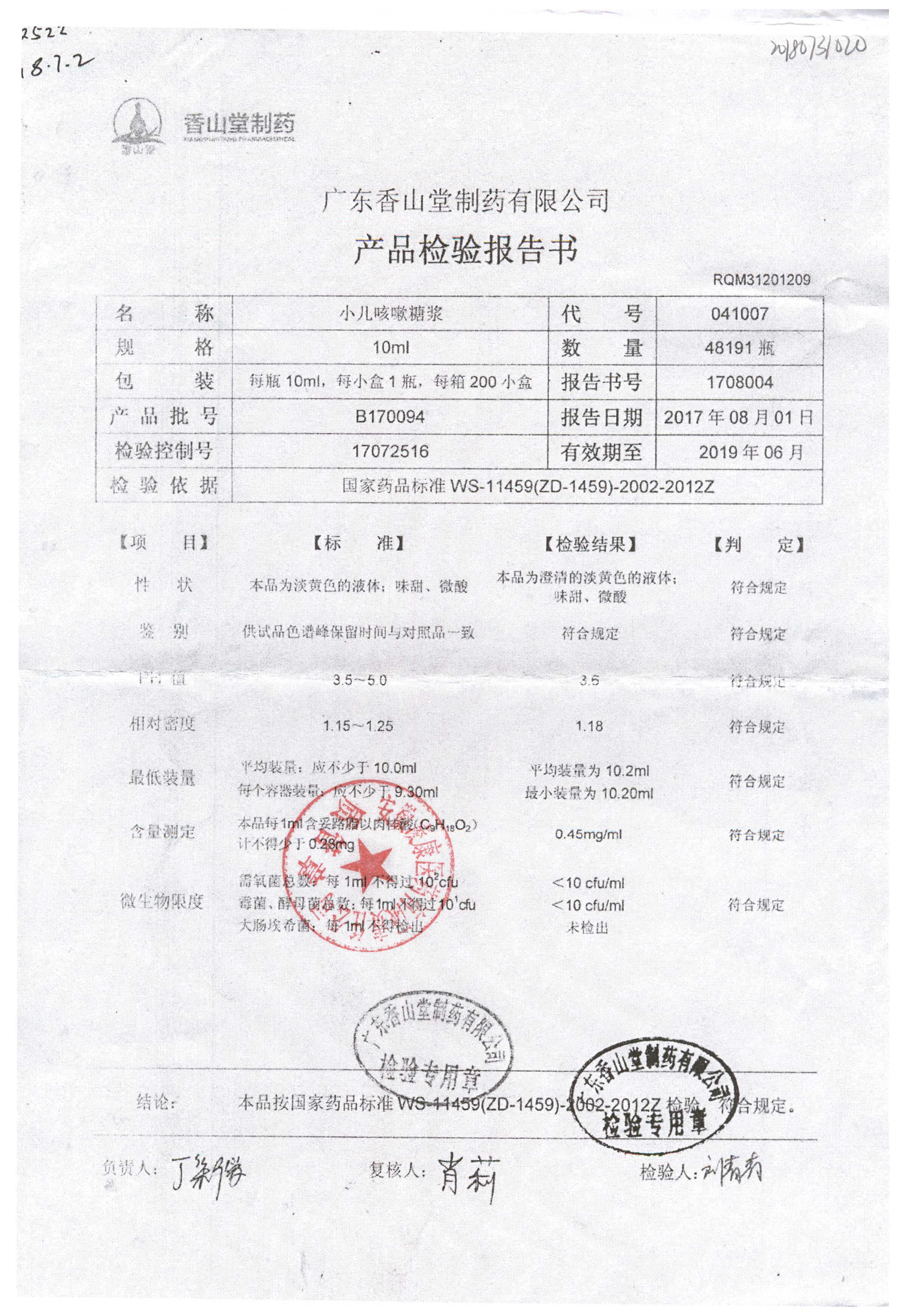 小兒咳嗽糖漿 | 10ml | B190117 | 查看詳情 |