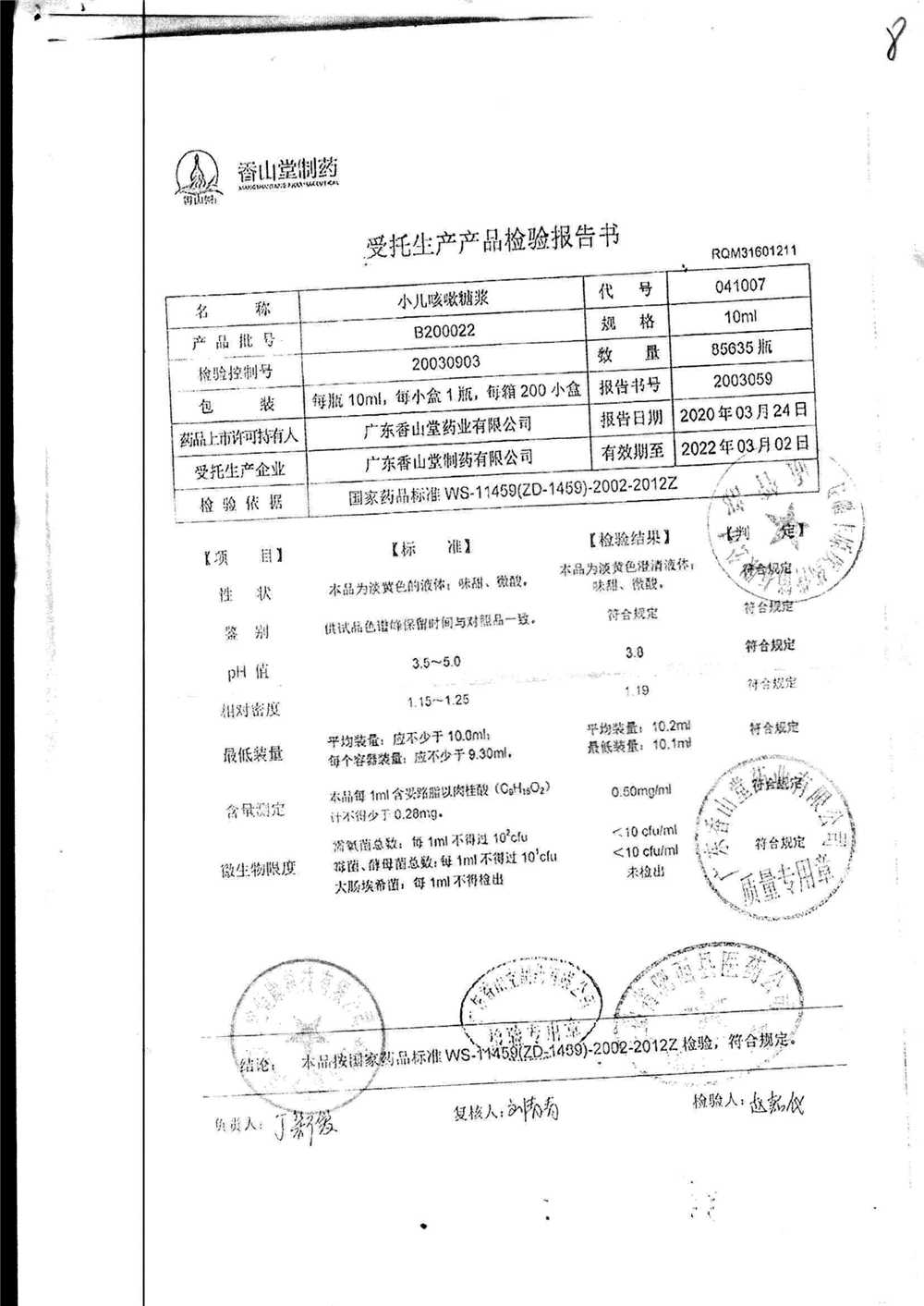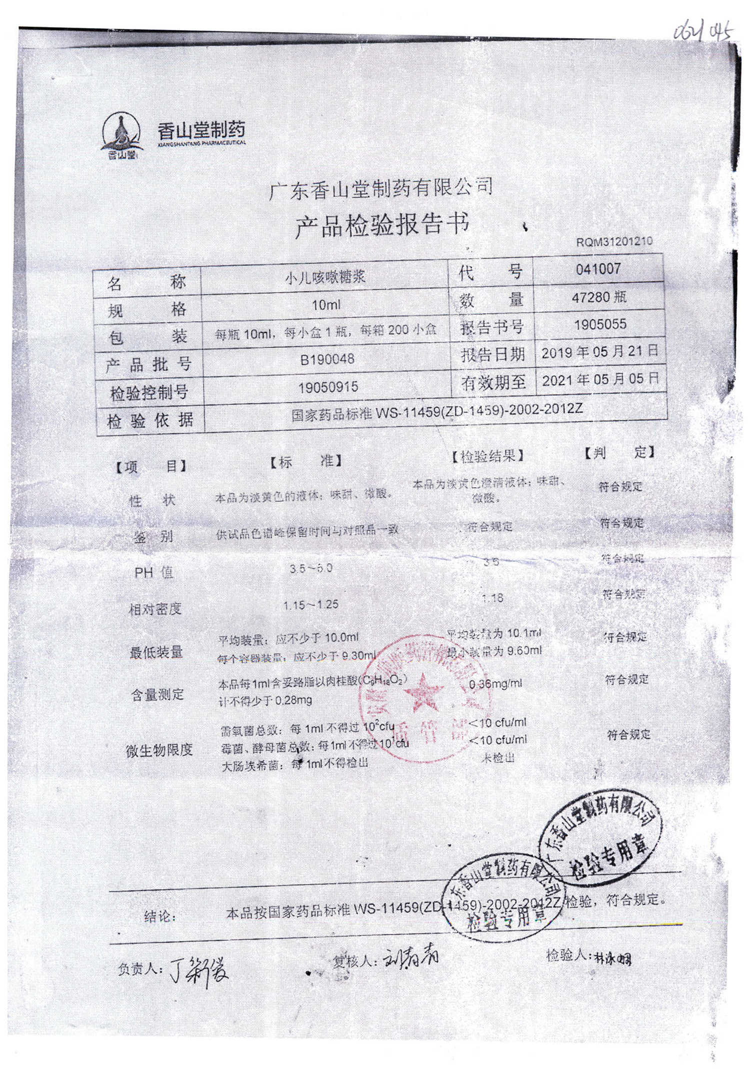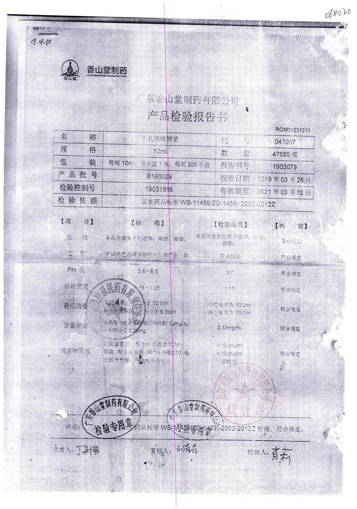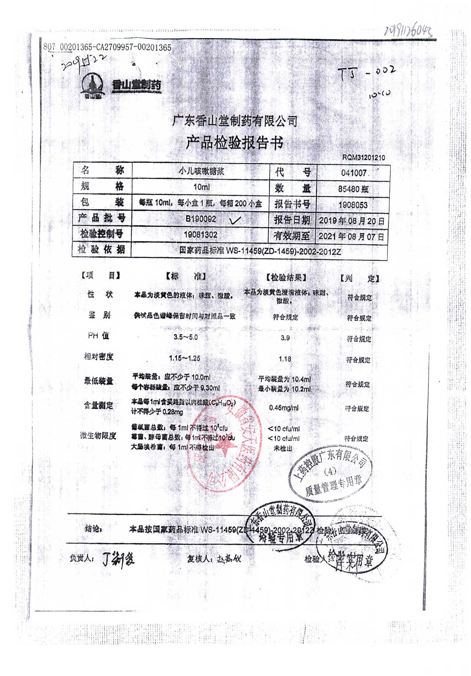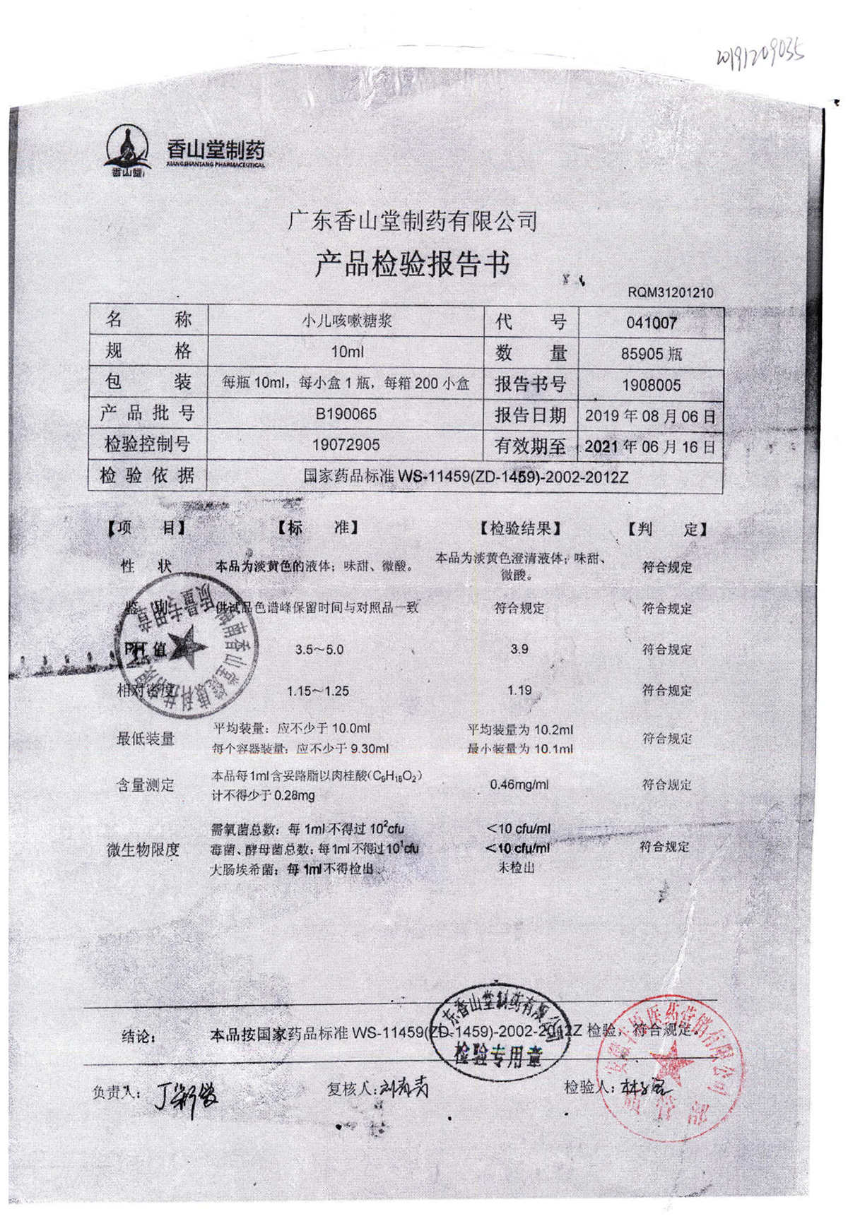 小兒咳嗽糖漿 | 10ml | B190119 | 查看詳情 |