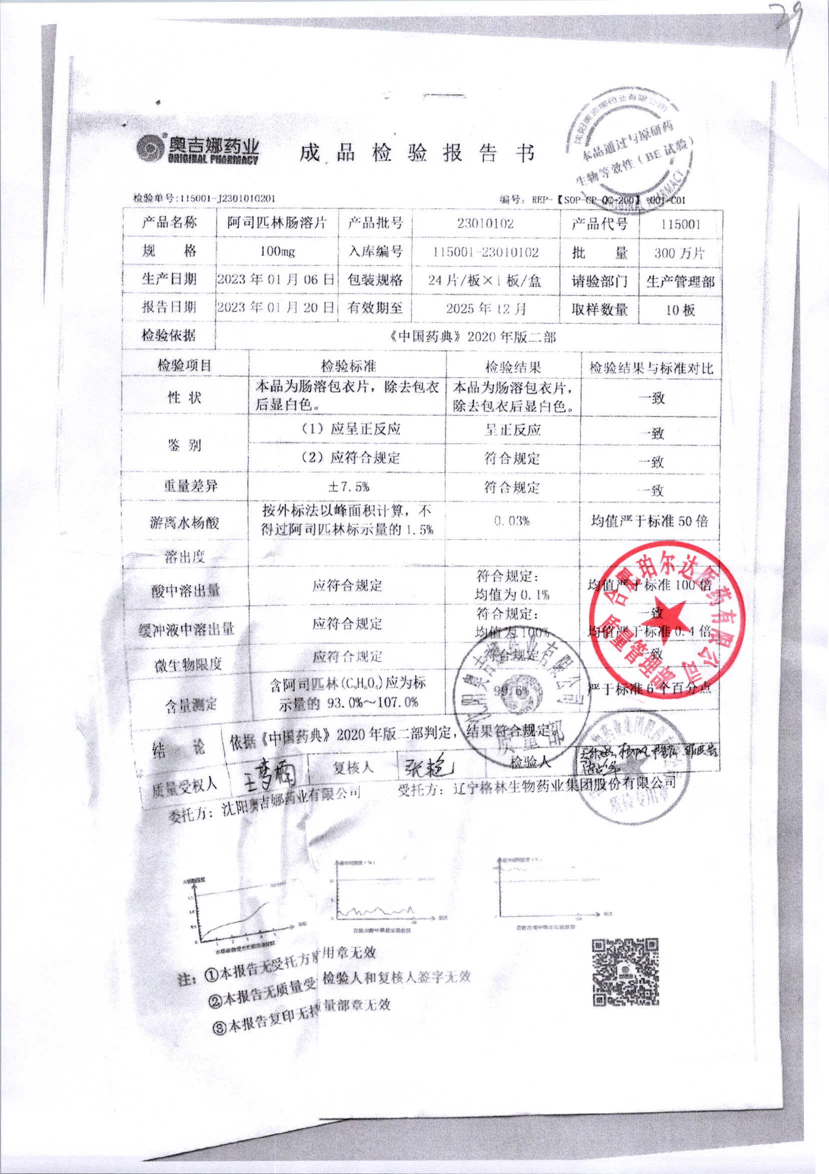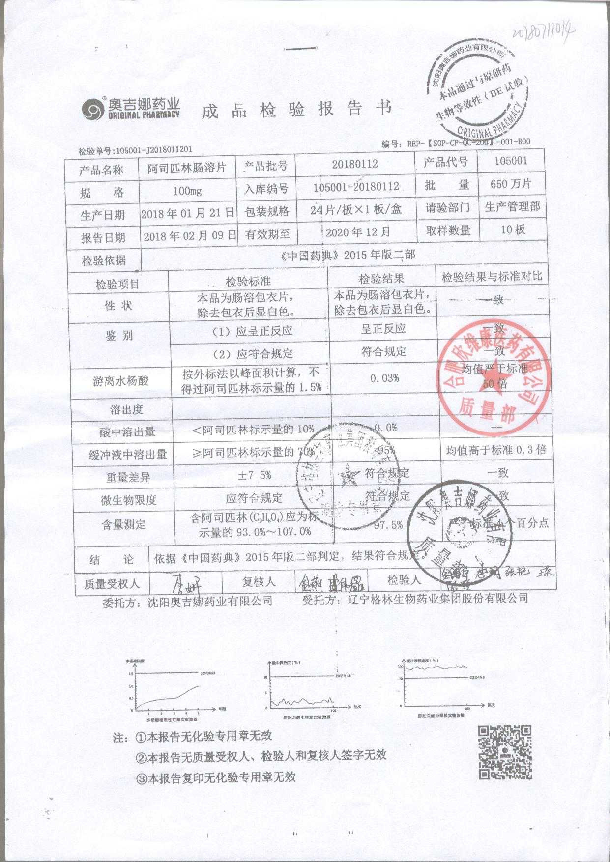 | 阿司匹林腸溶片 | 100mg*24s | 20180111 | 查看詳情 |