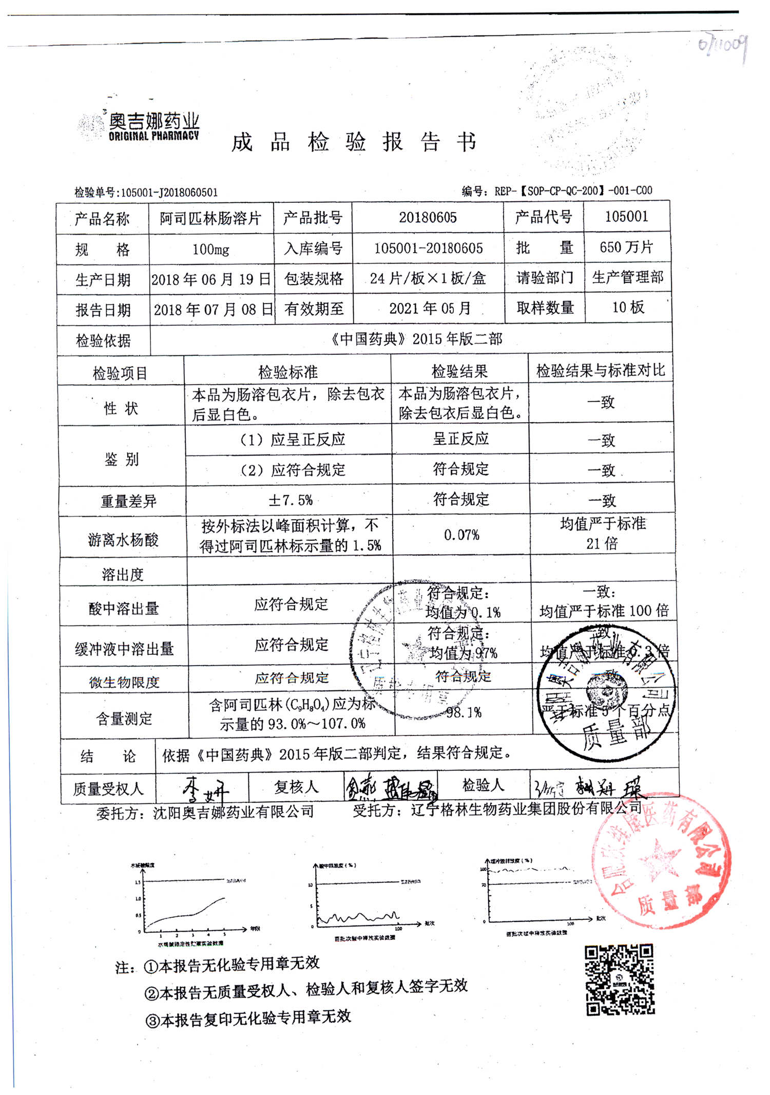 | 阿司匹林腸溶片 | 100mg*24s | 20180605 | 查看詳情 |