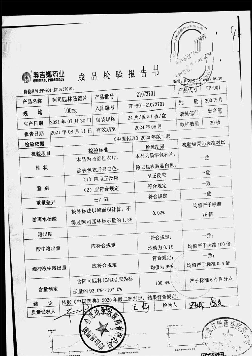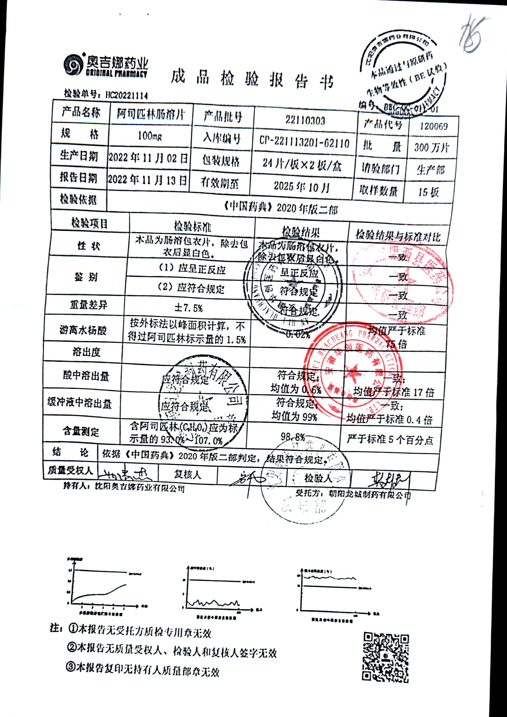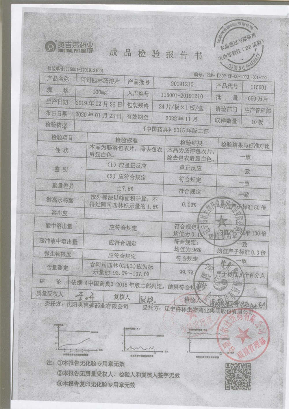| 阿司匹林腸溶片 | 100mg*24s | 20191210 | 查看詳情 |
