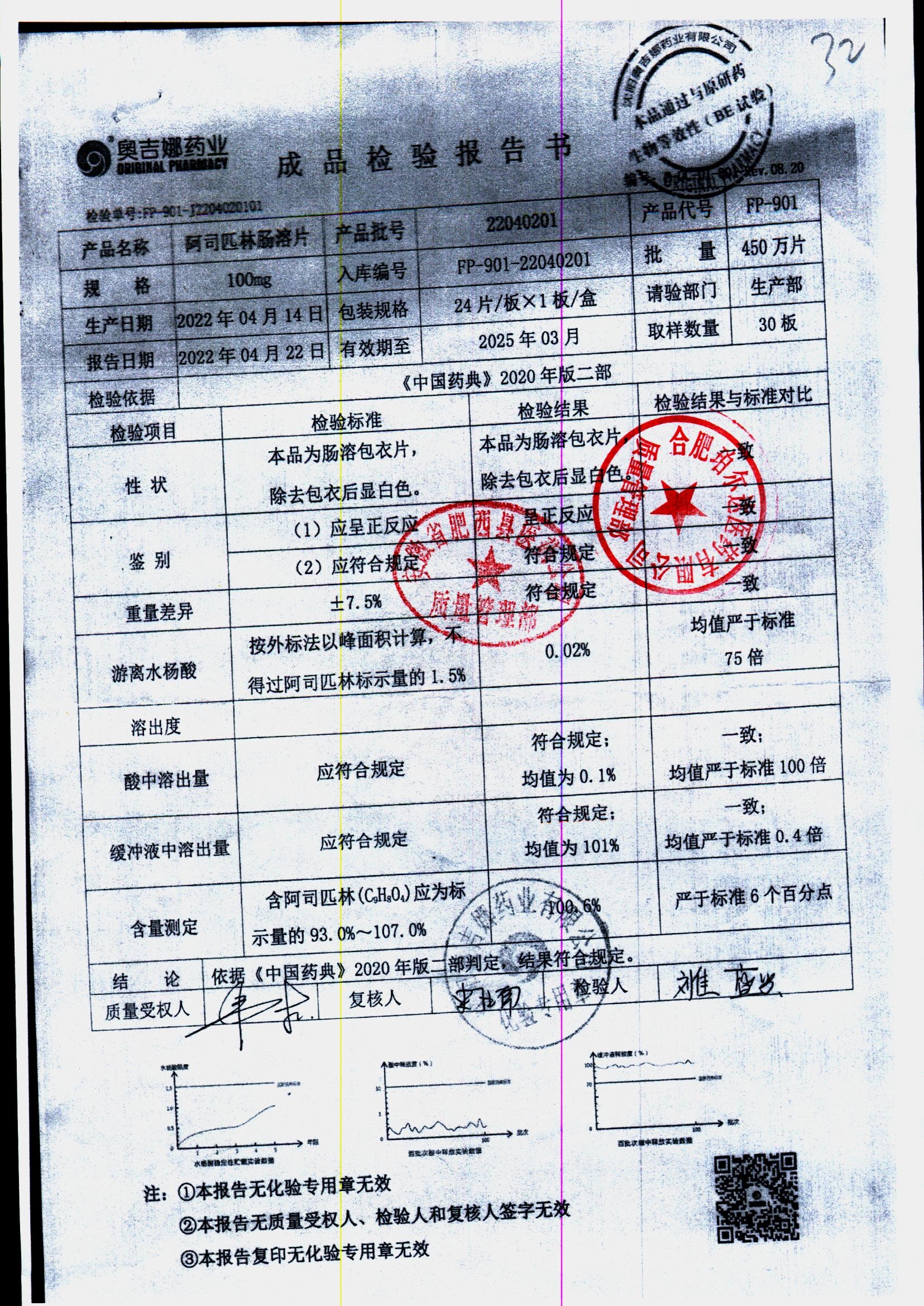 | 阿司匹林腸溶片 | 100mg*24s | 20180308 | 查看詳情 |
