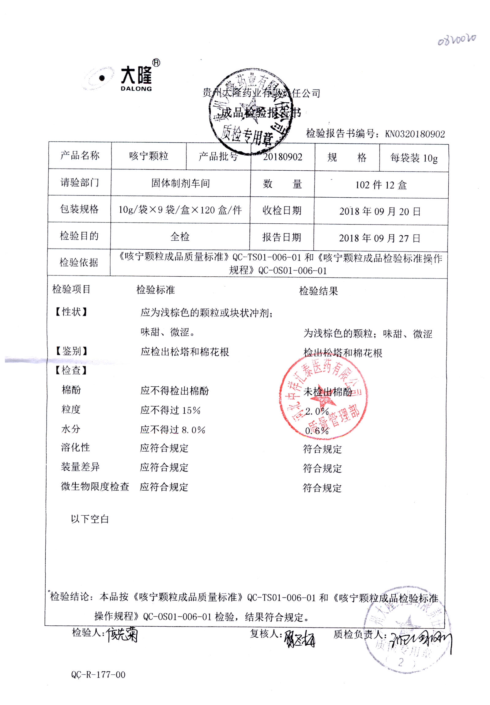 | 咳寧顆粒 | 10g*9袋 | 20180902 | 查看詳情 |