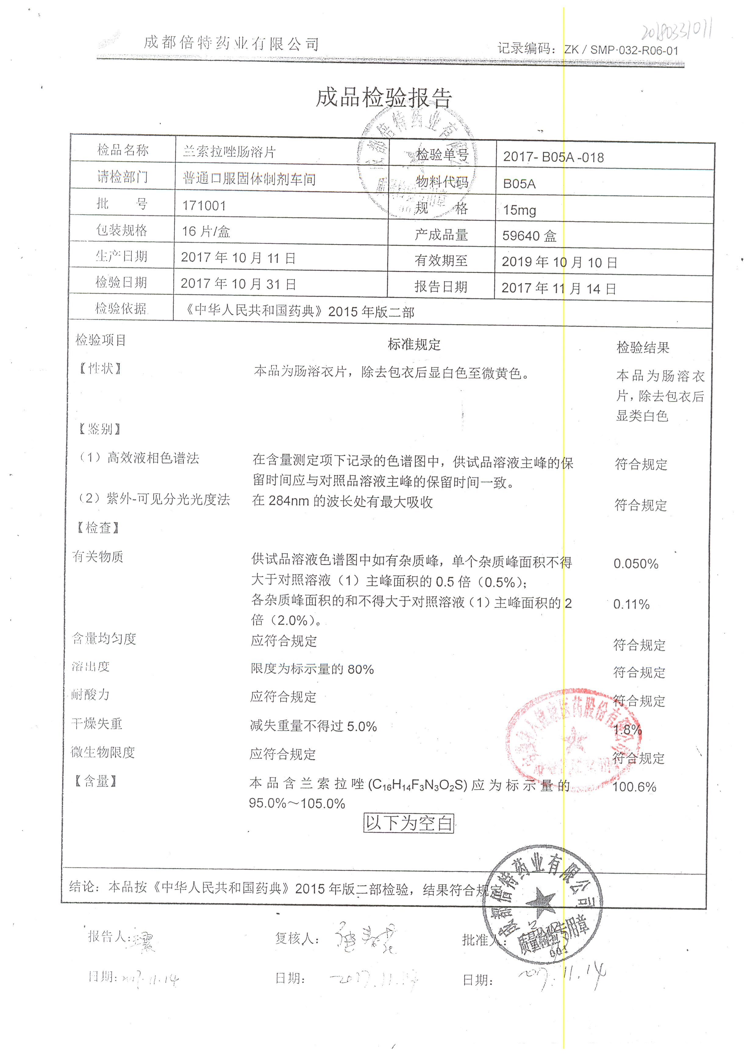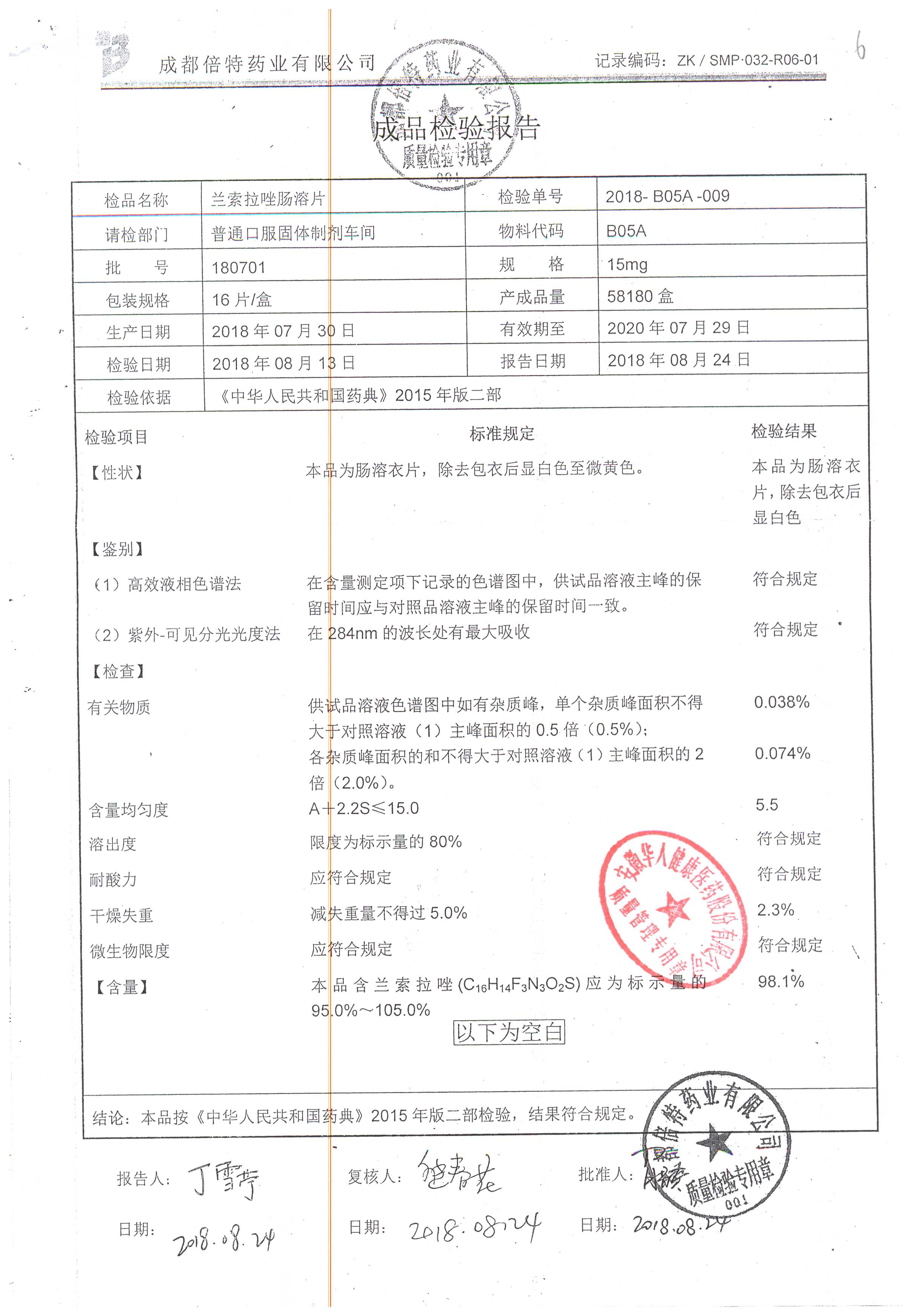 | 蘭索拉唑腸溶片 | 15mg*16s | 180701 | 查看詳情 |