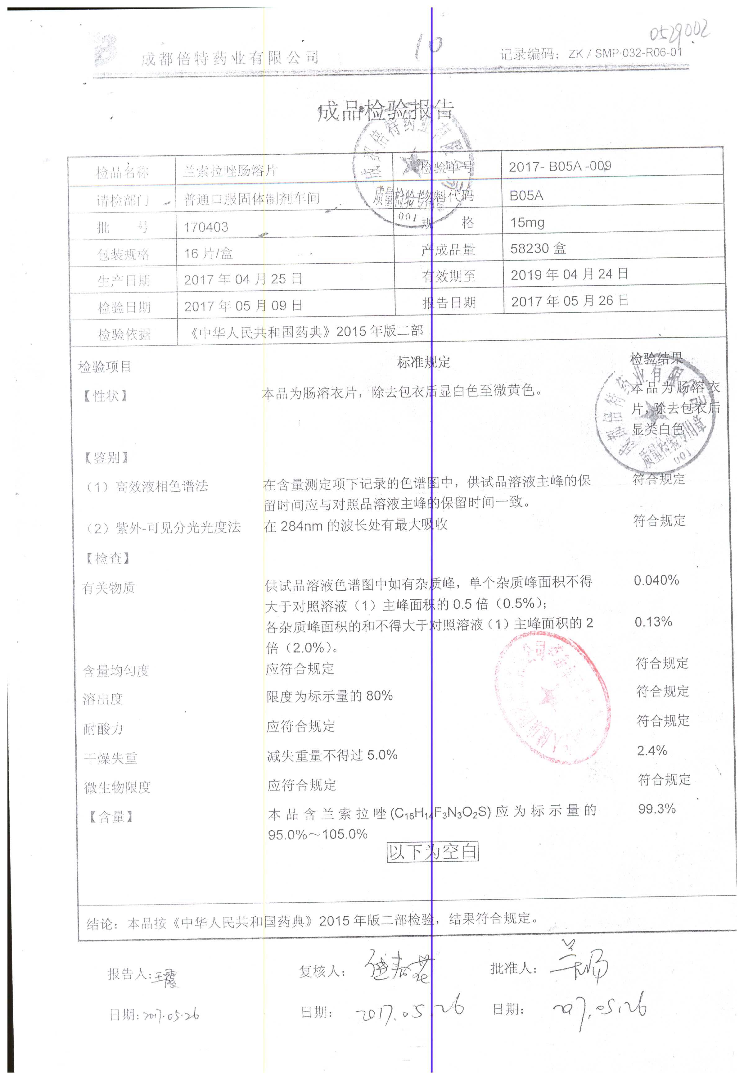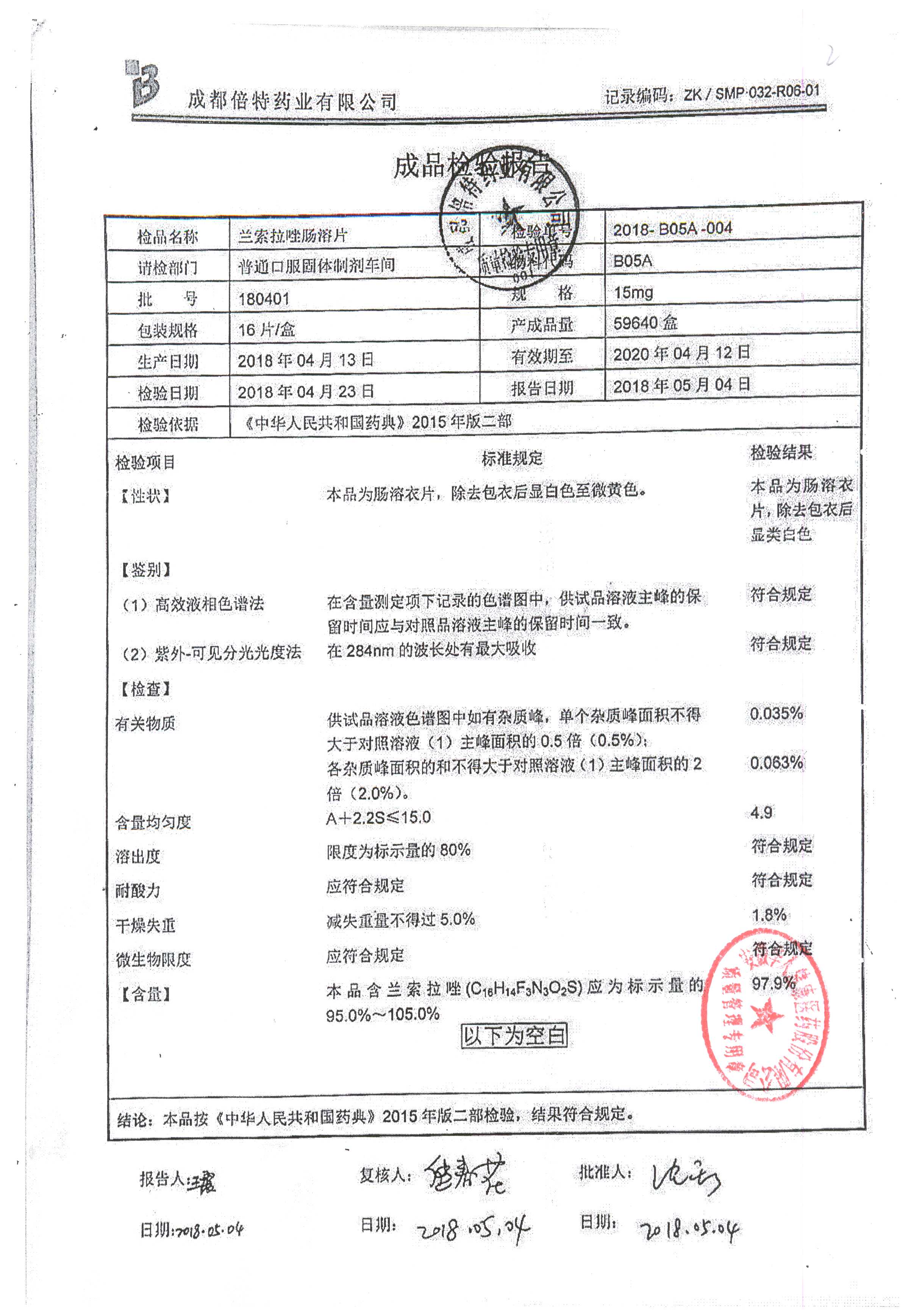 | 蘭索拉唑腸溶片 | 15mg*16s | 180401 | 查看詳情 |
