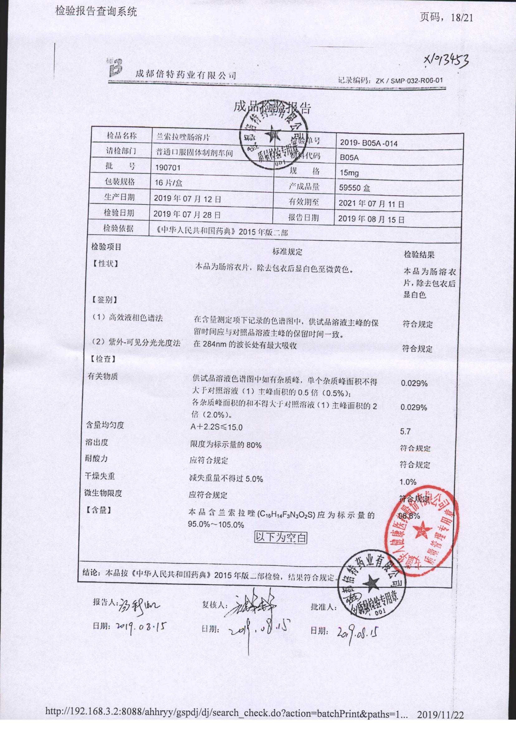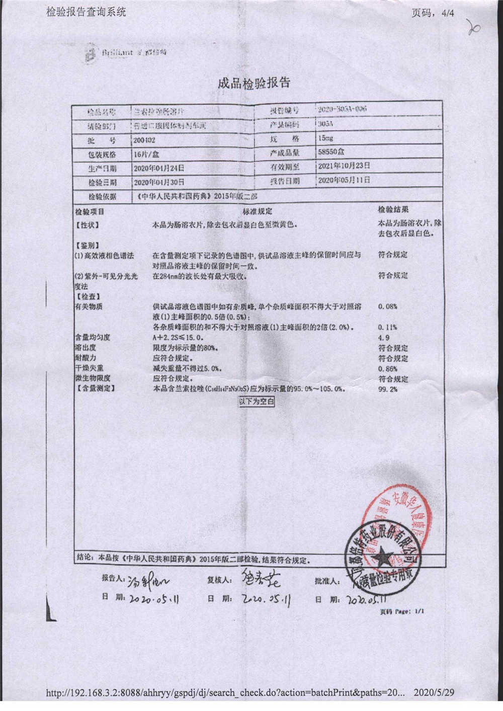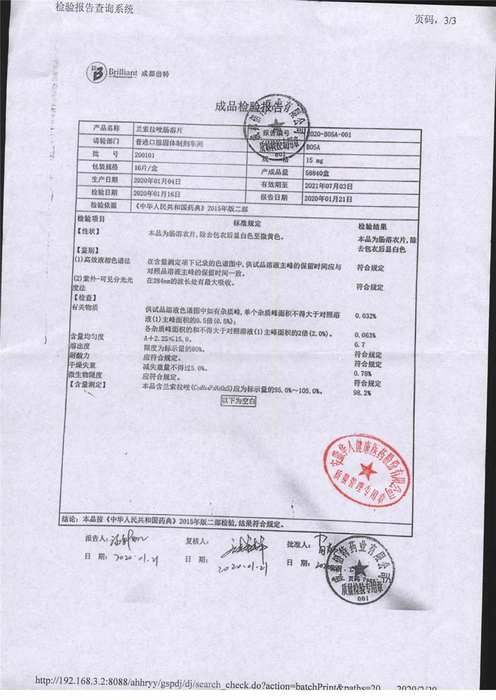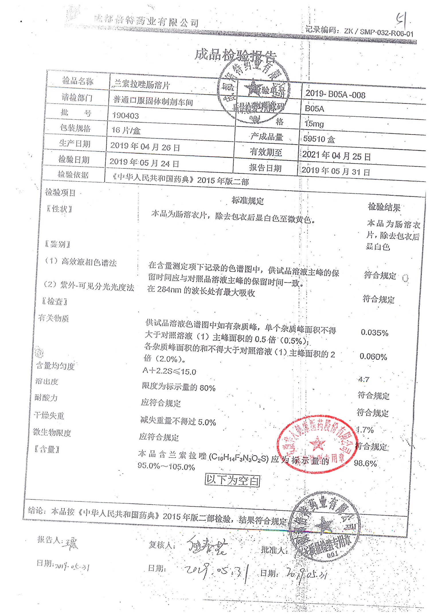 | 蘭索拉唑腸溶片 | 15mg*16s | 190701 | 查看詳情 |