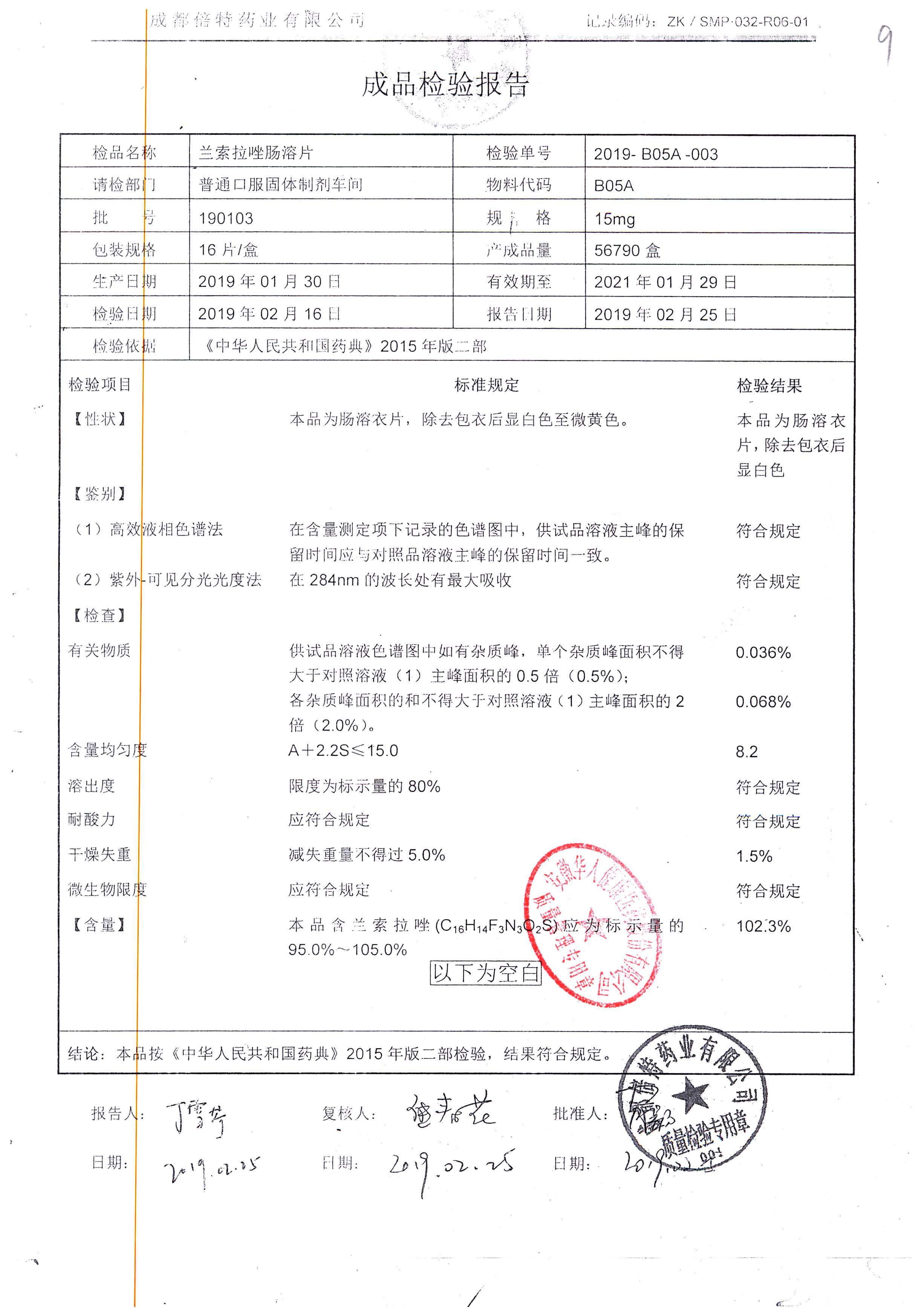 | 蘭索拉唑腸溶片 | 15mg*16s | 190403 | 查看詳情 |