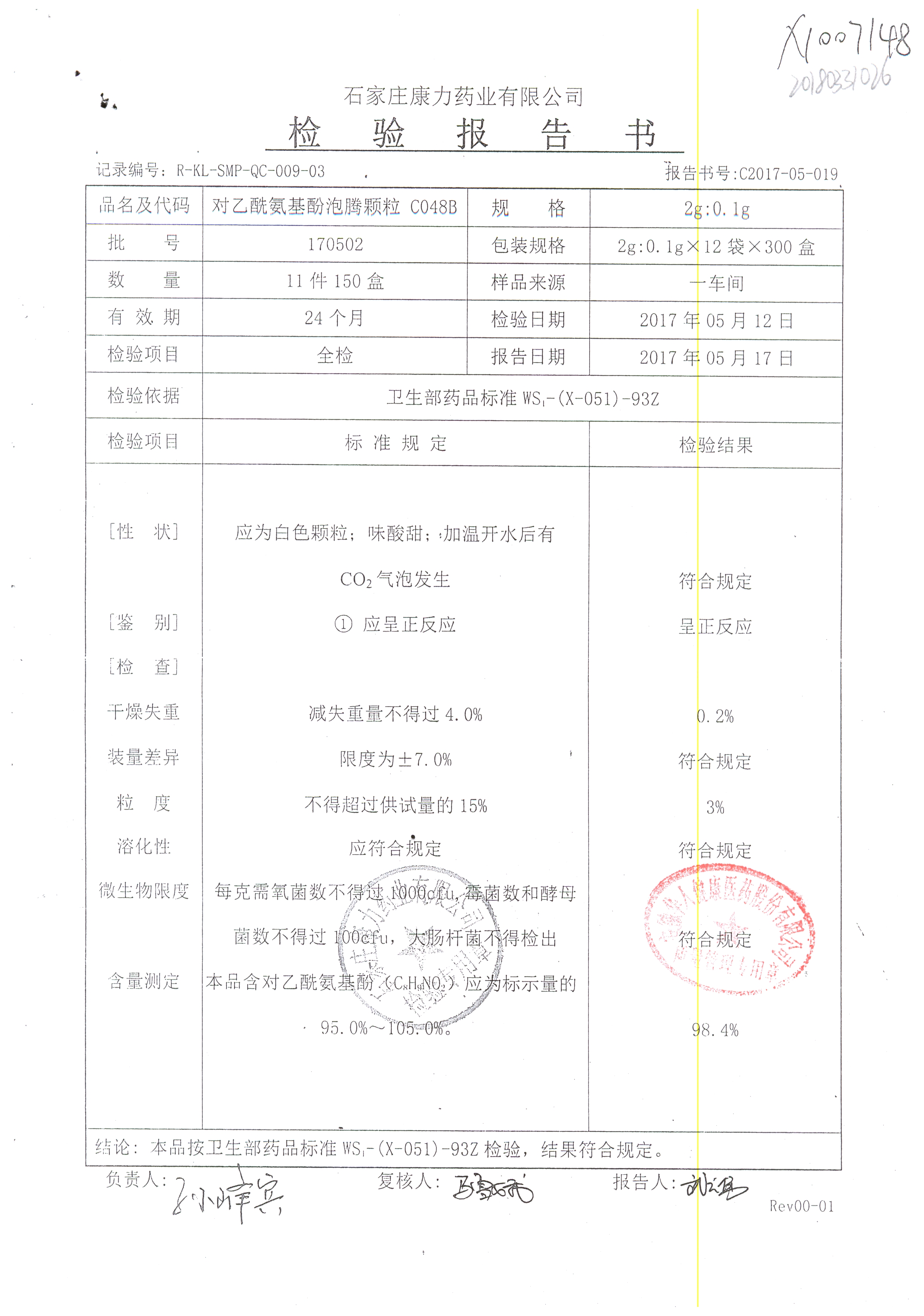 | 對(duì)乙醯氨基酚泡騰顆粒 | 2g:0.1g | 170502 | 查看詳情 |