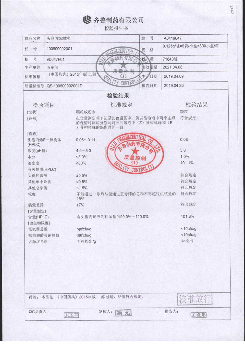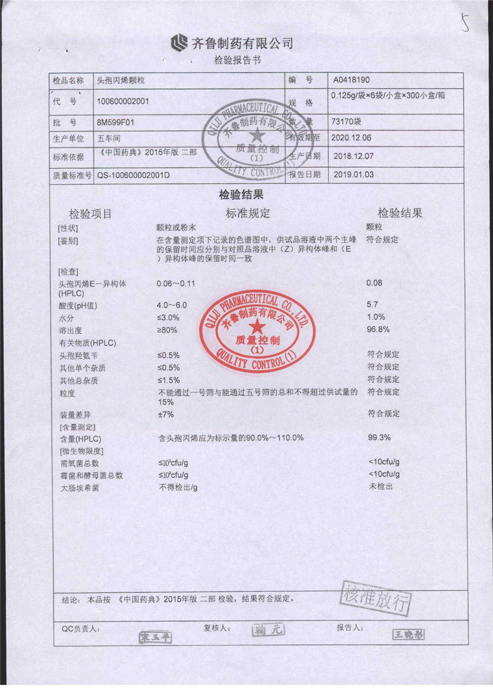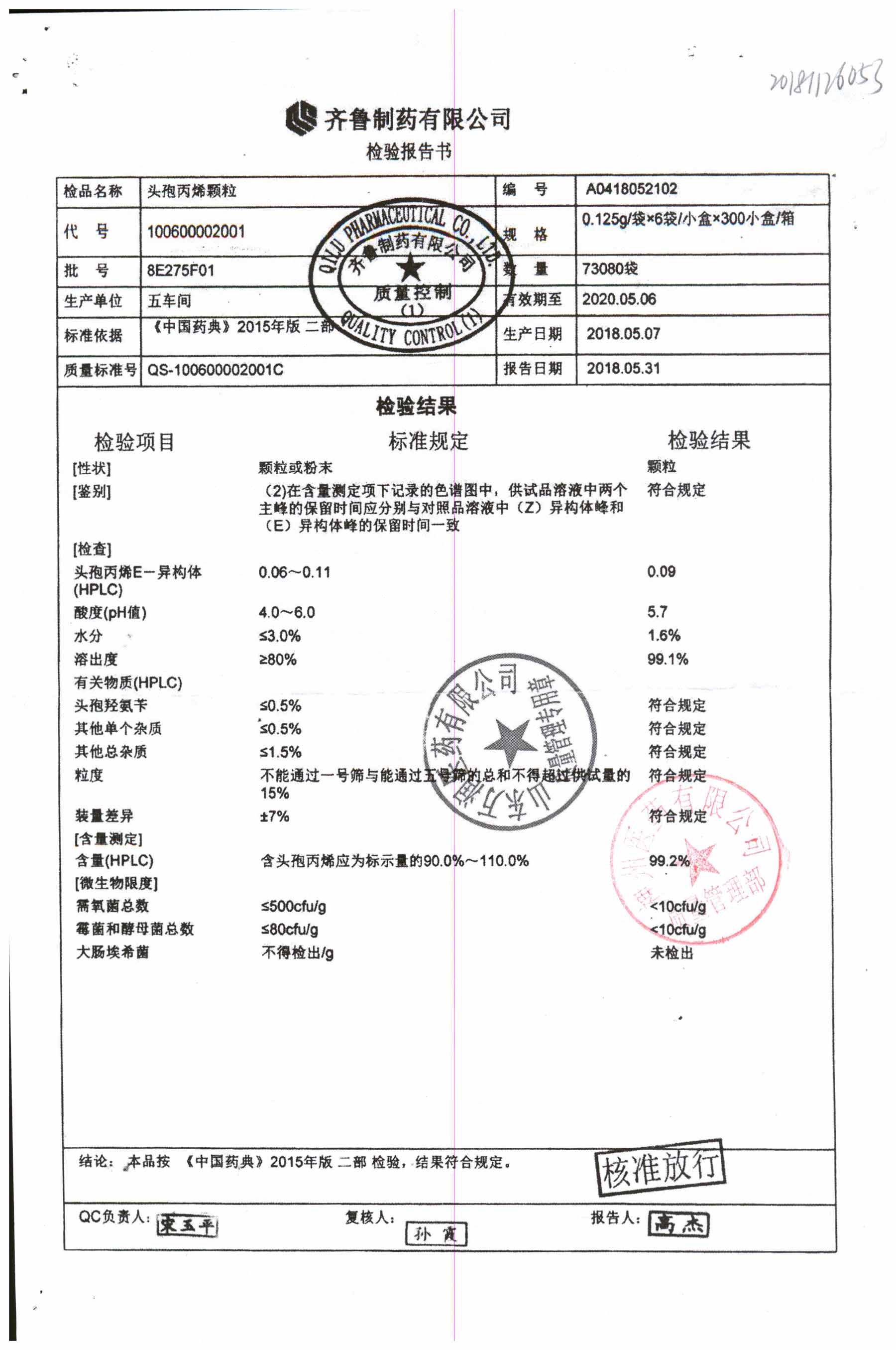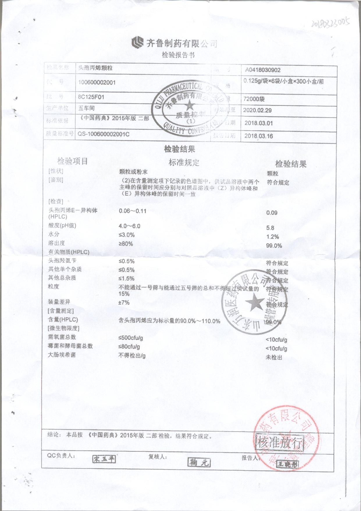| 頭孢丙烯顆粒 | 0.125g*6袋 | 8H451F01 | 查看詳情 |