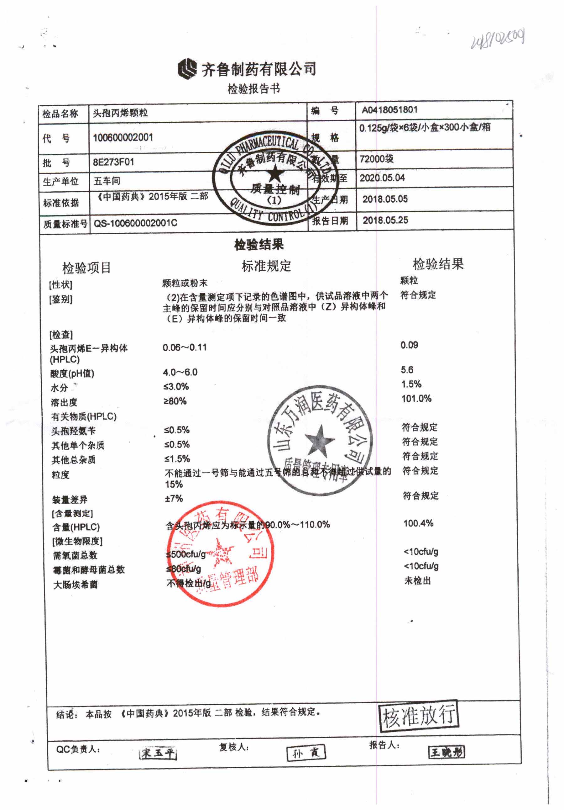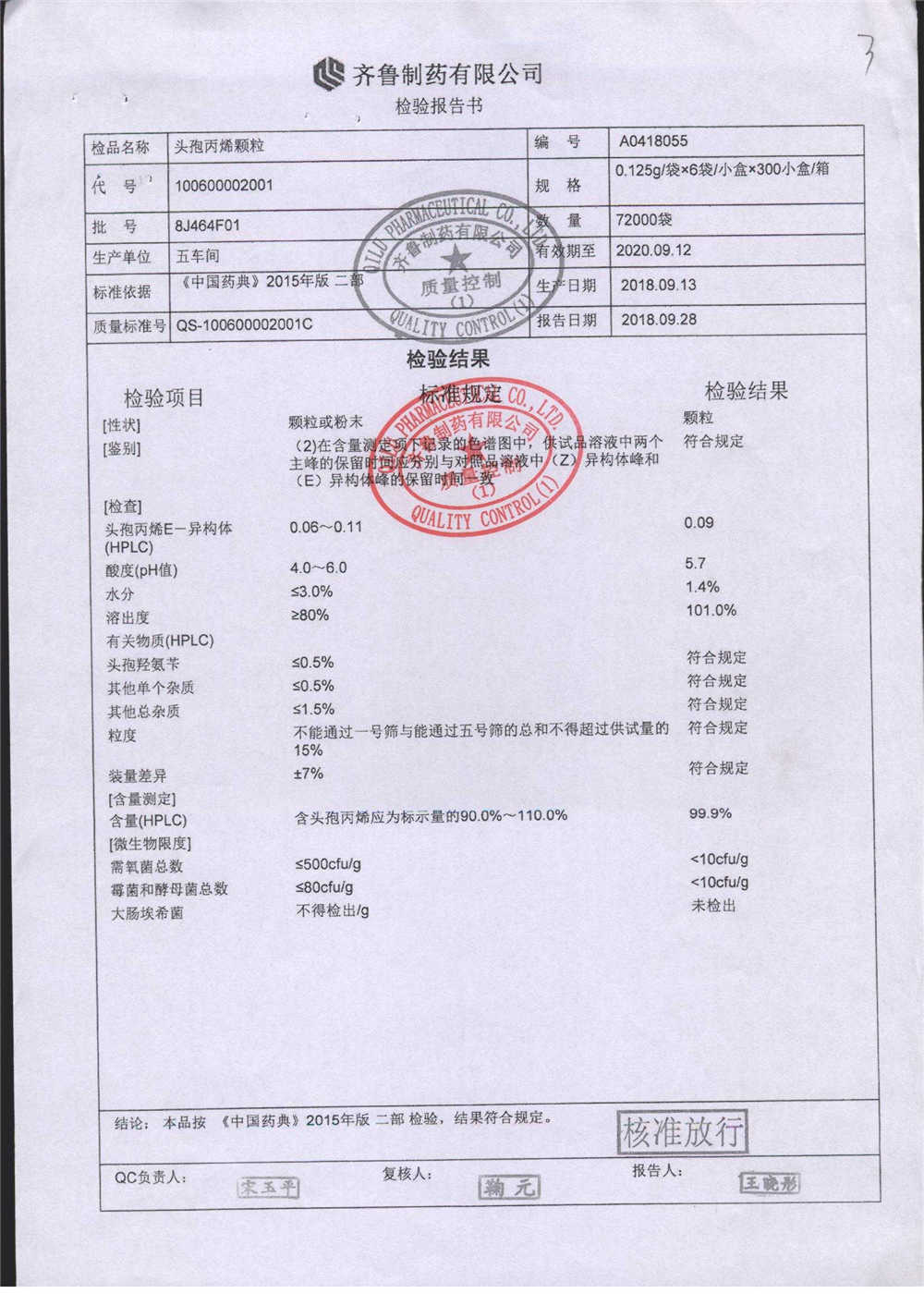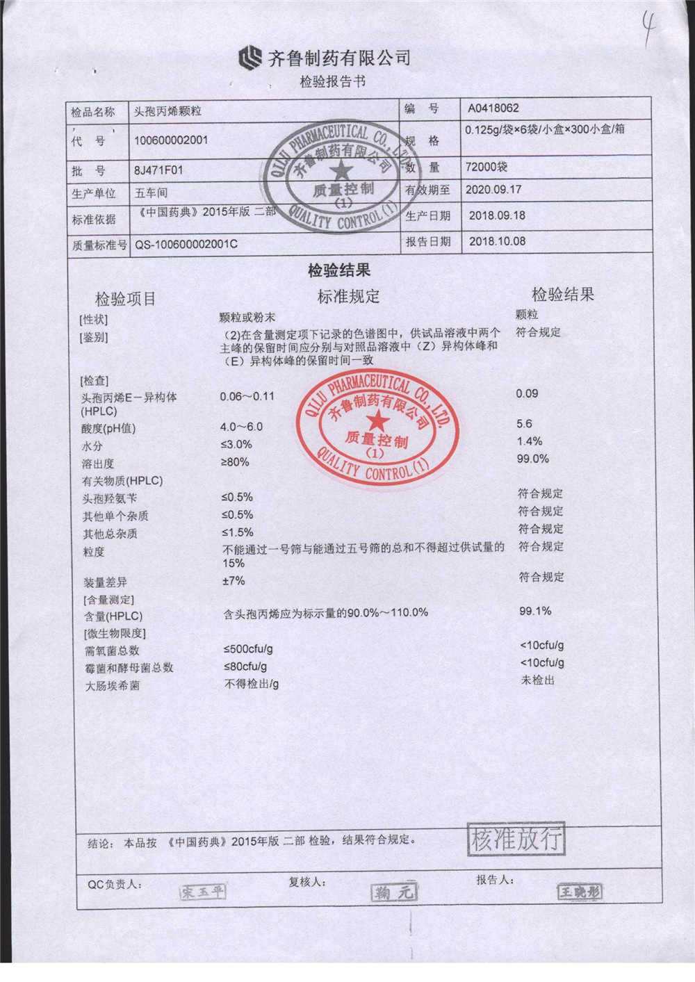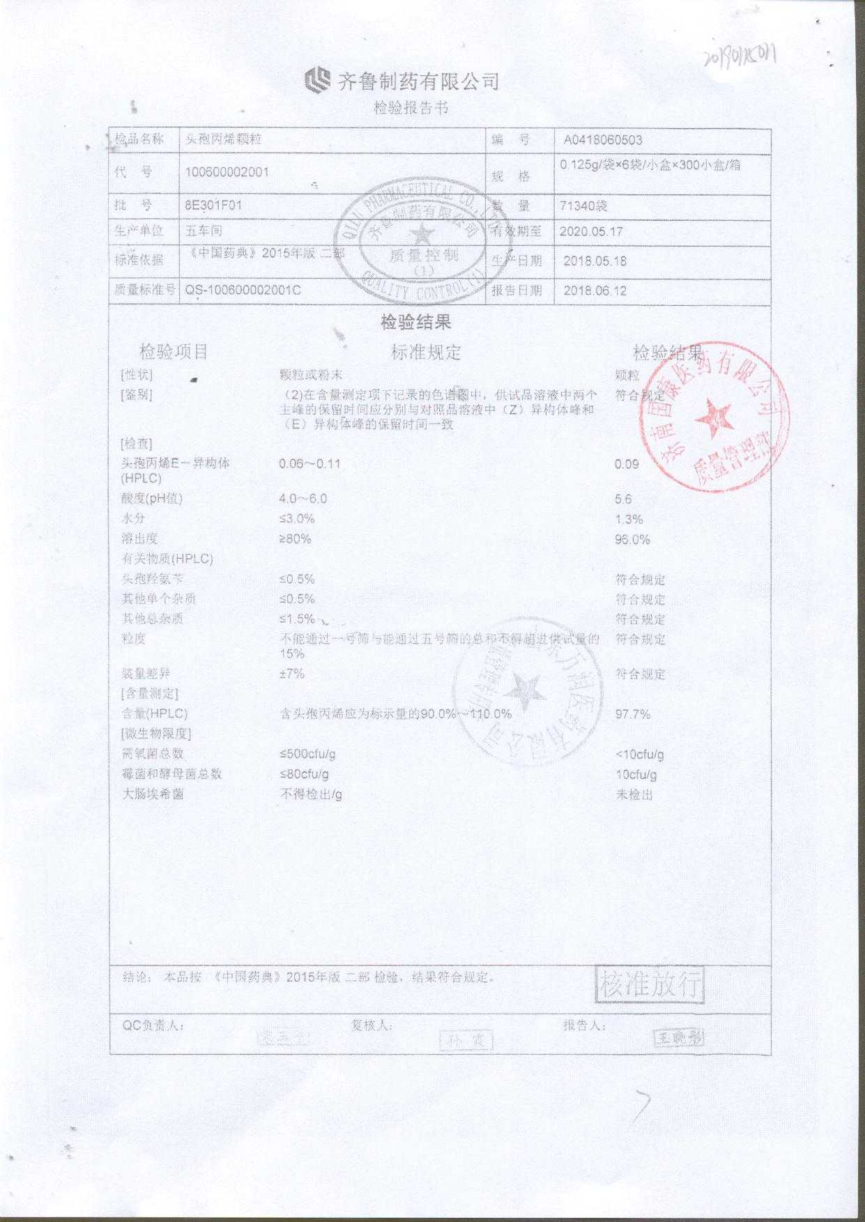 | 頭孢丙烯顆粒 | 0.125g*6袋 | 8H451F01 | 查看詳情 |