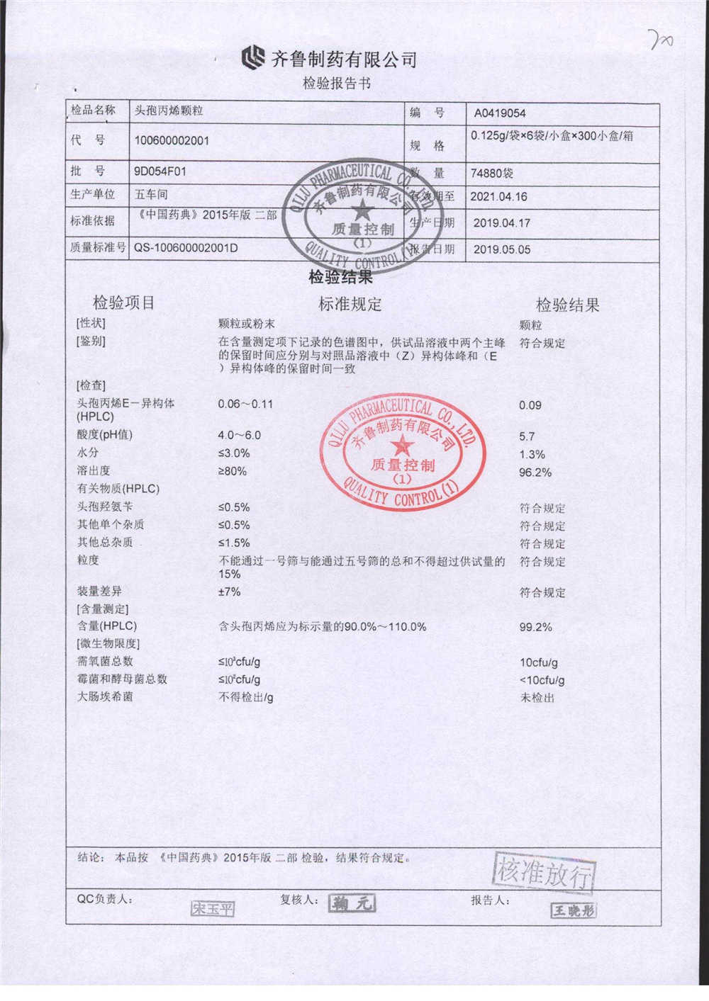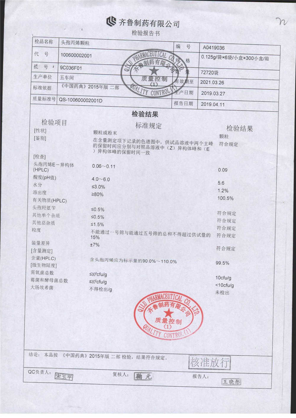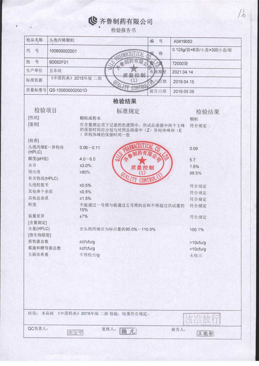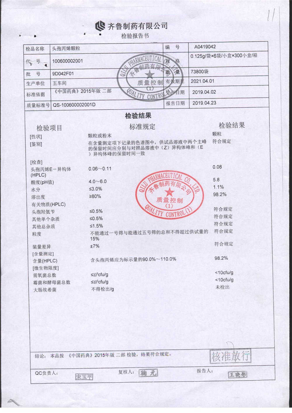 | 頭孢丙烯顆粒 | 0.125g*6袋 | 9D040F01 | 查看詳情 |