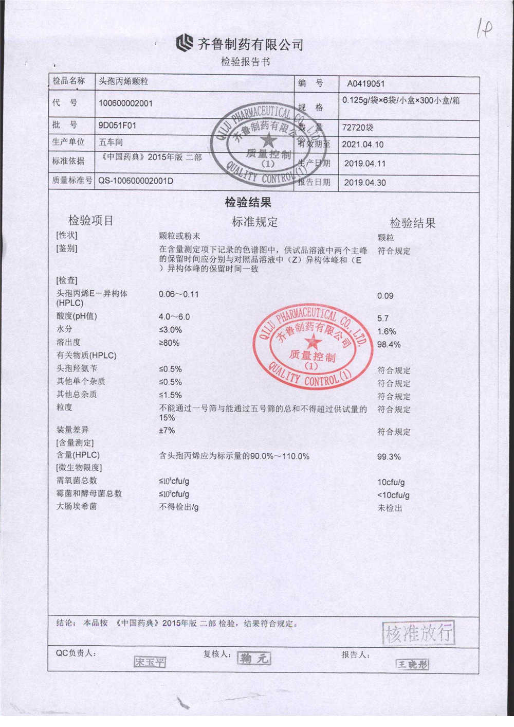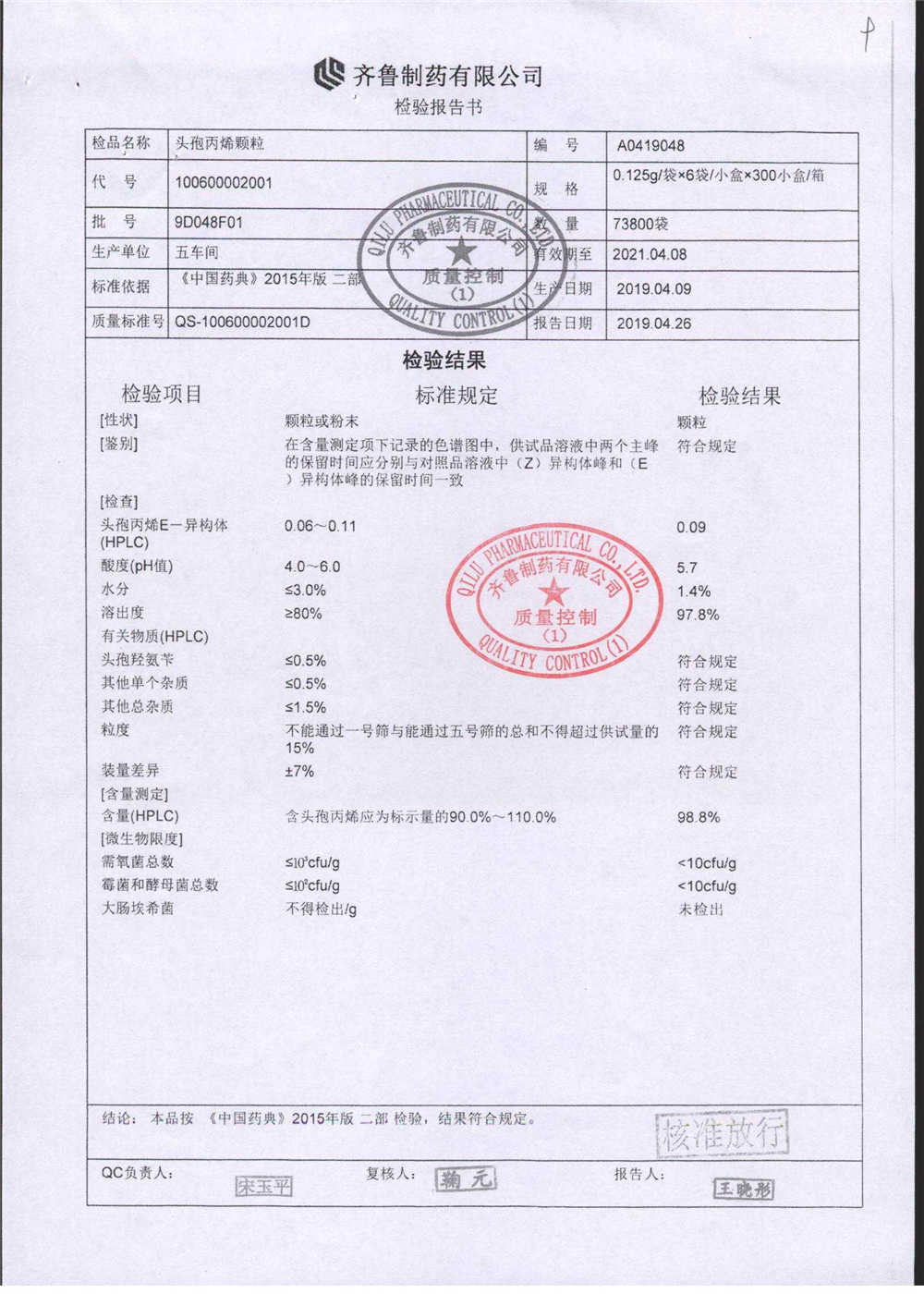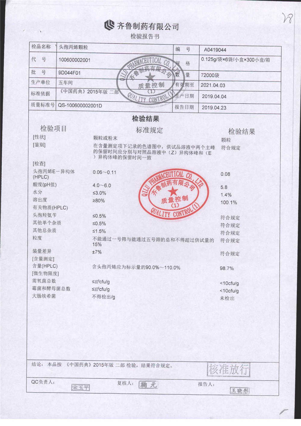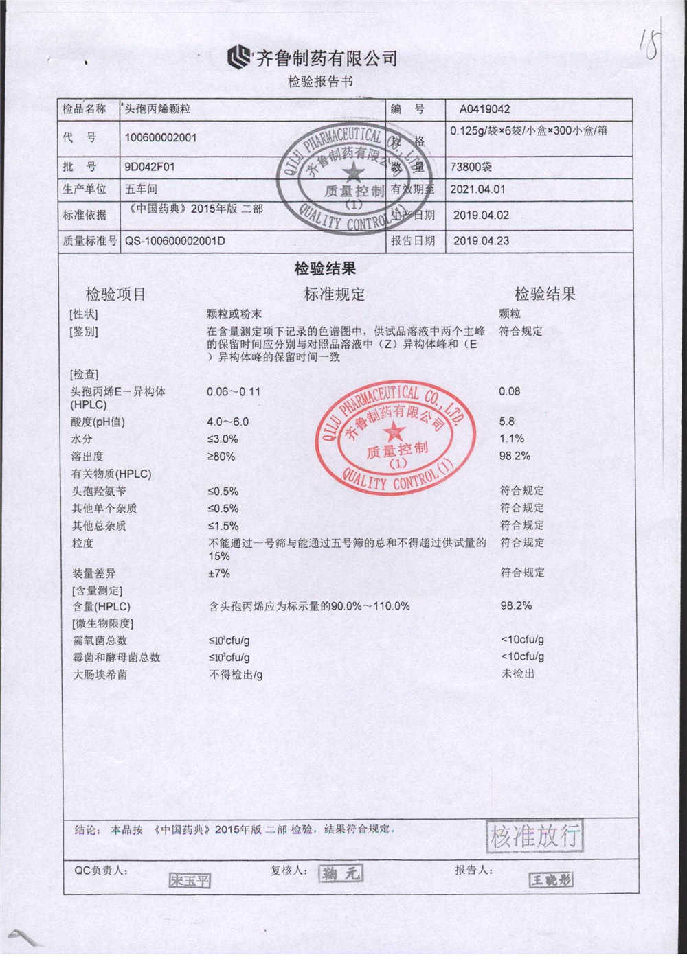 | 頭孢丙烯顆粒 | 0.125g*6袋 | 9D040F01 | 查看詳情 |