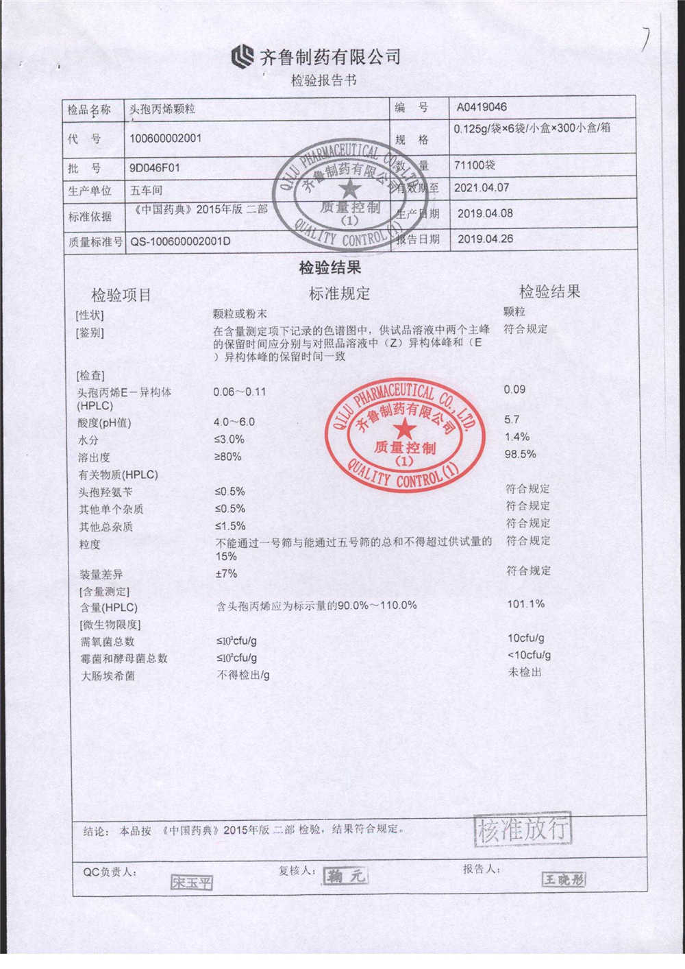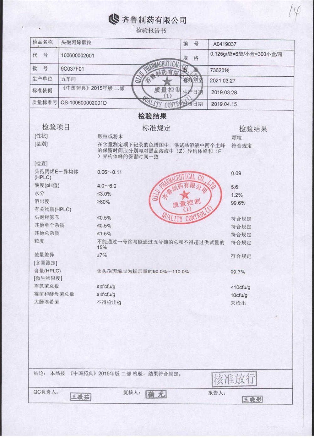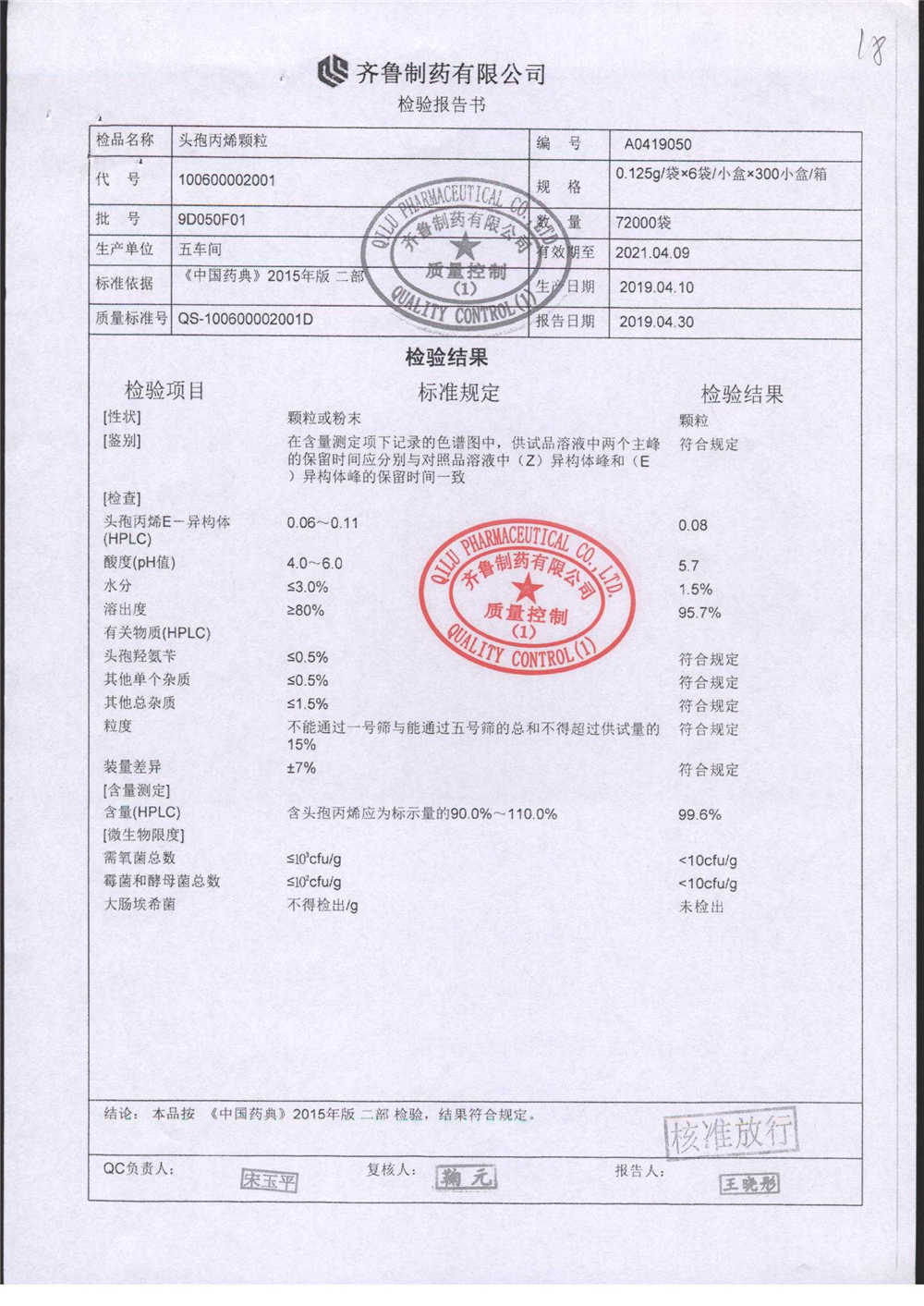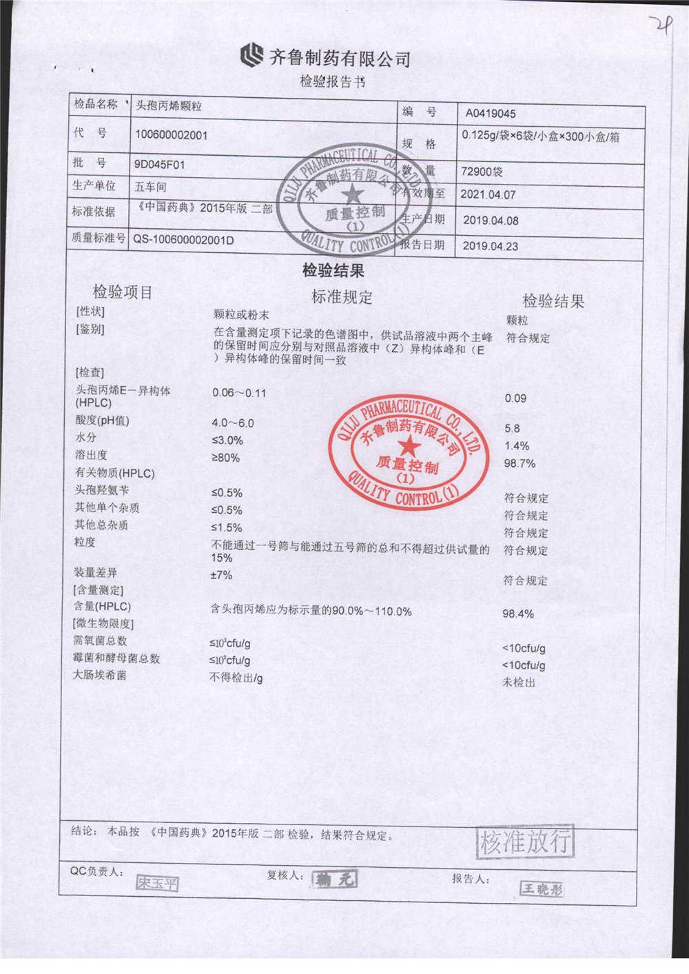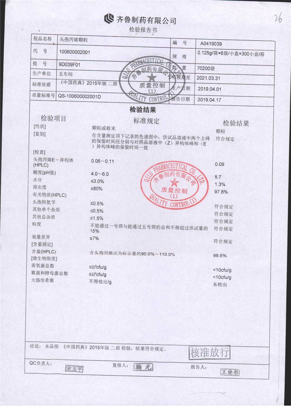 | 頭孢丙烯顆粒 | 0.125g*6袋 | 9D040F01 | 查看詳情 |