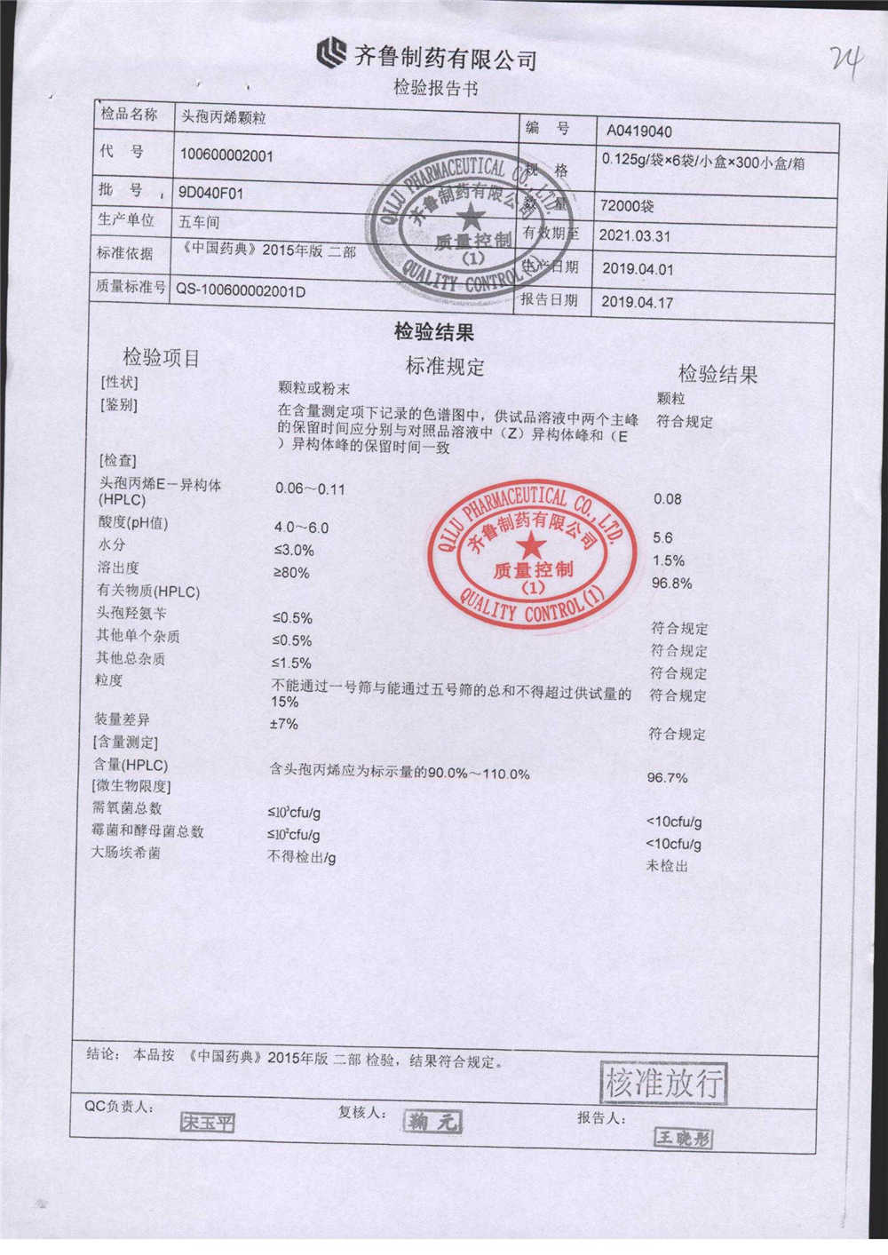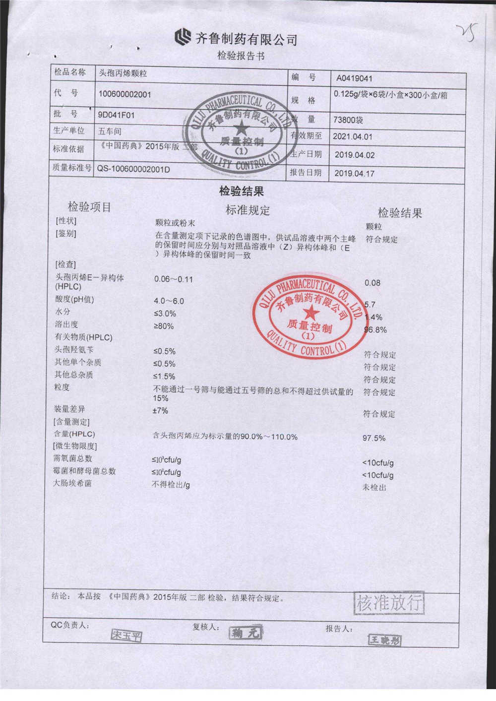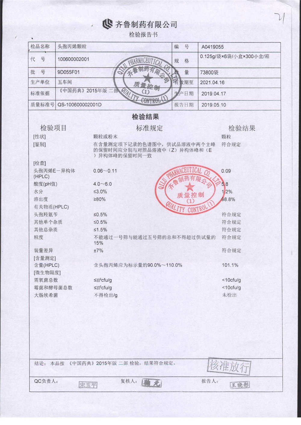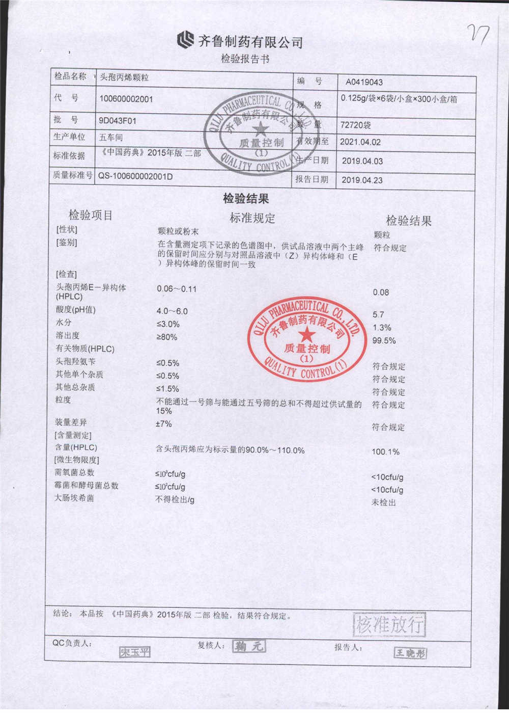 | 頭孢丙烯顆粒 | 0.125g*6袋 | 9D040F01 | 查看詳情 |