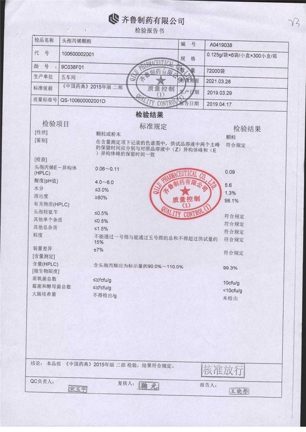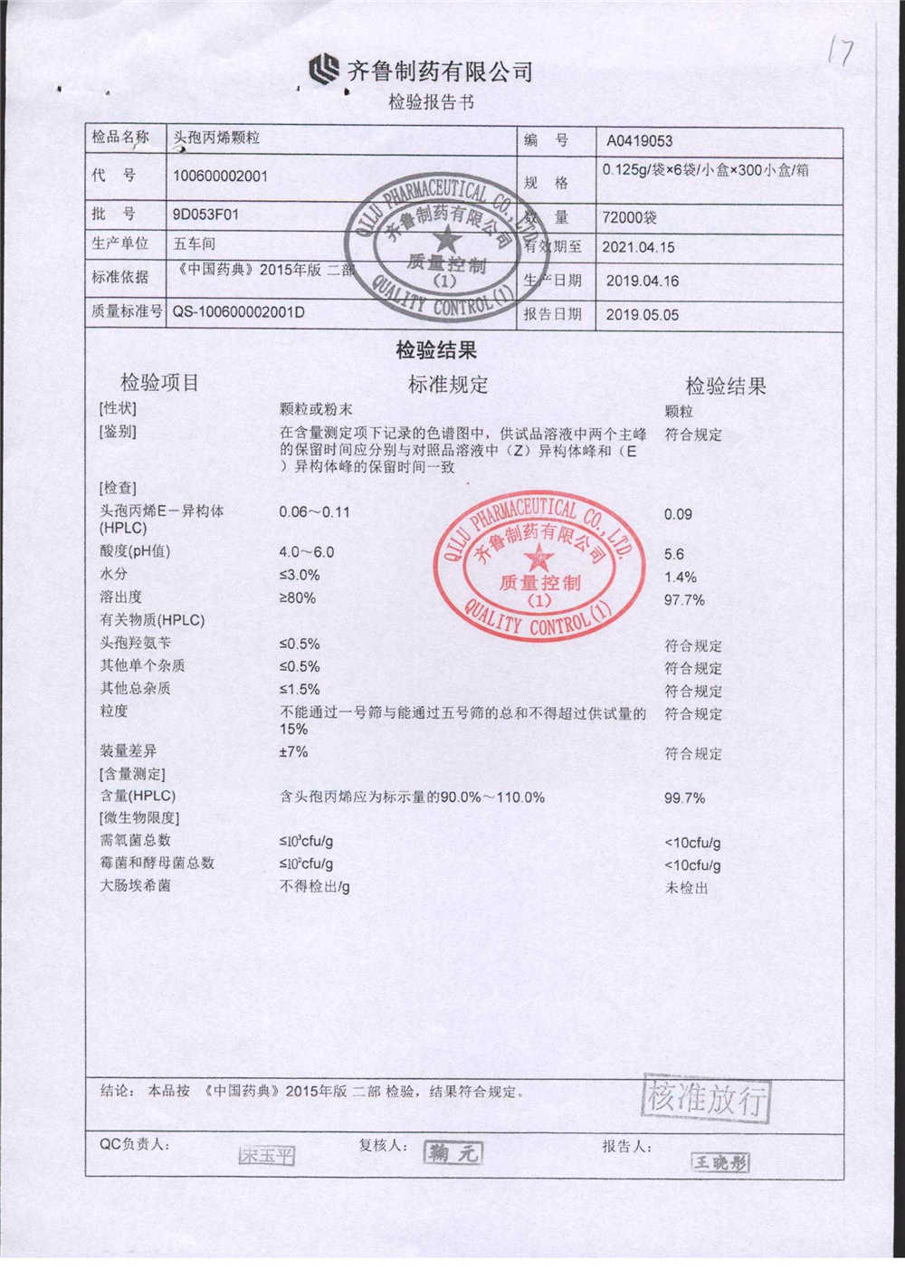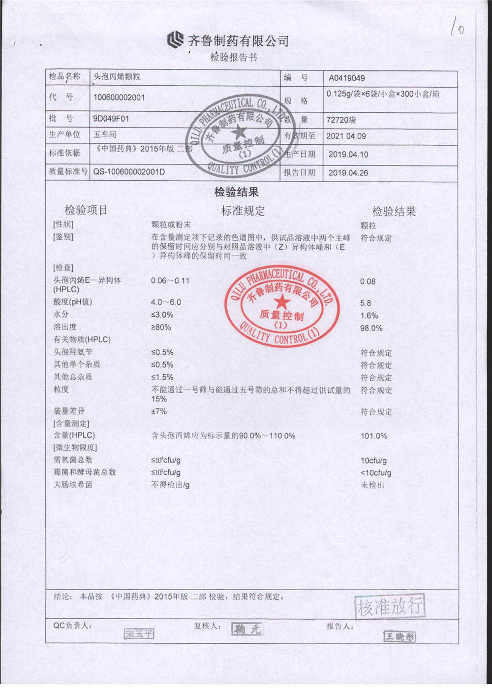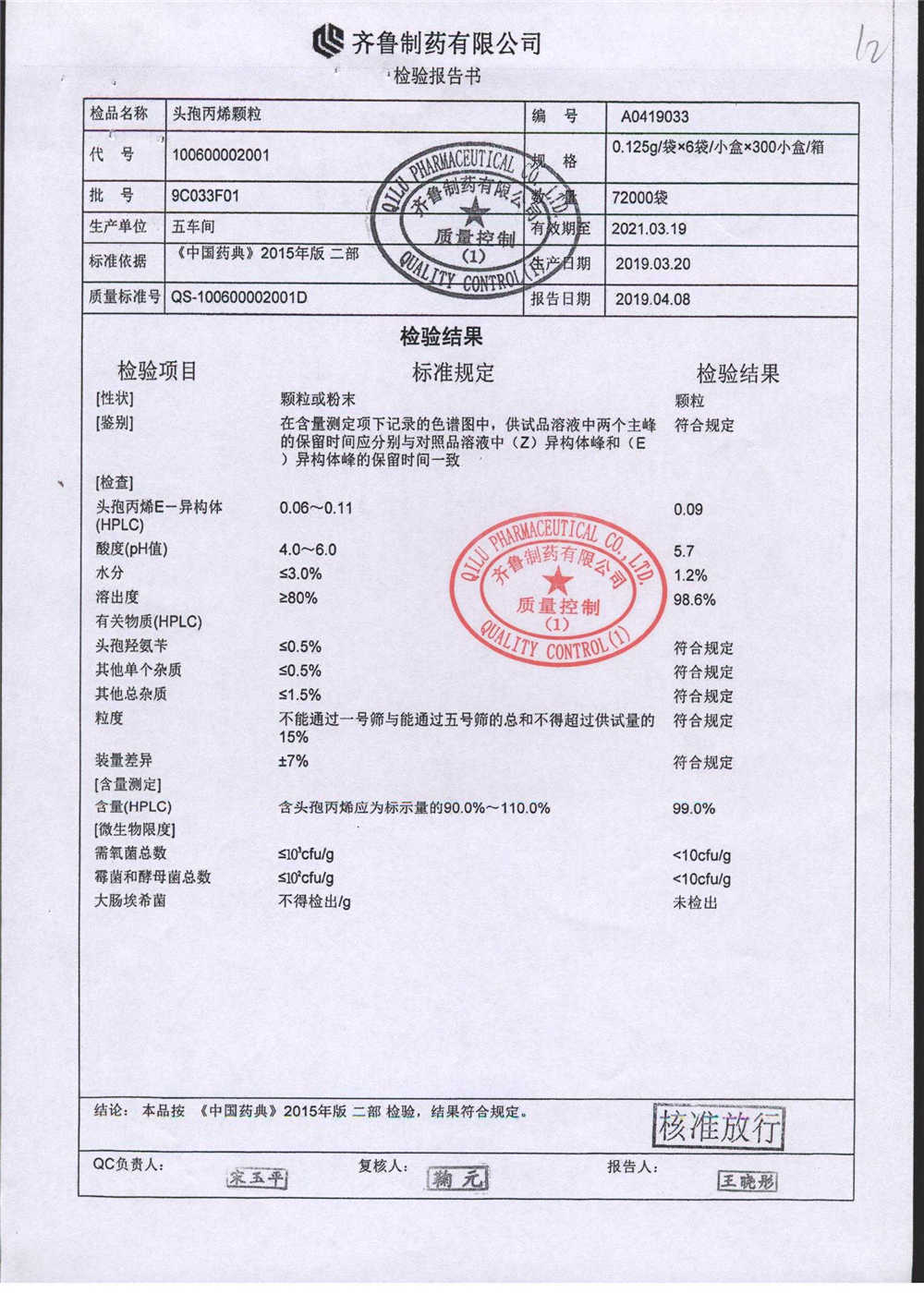 | 頭孢丙烯顆粒 | 0.125g*6袋 | 9D040F01 | 查看詳情 |