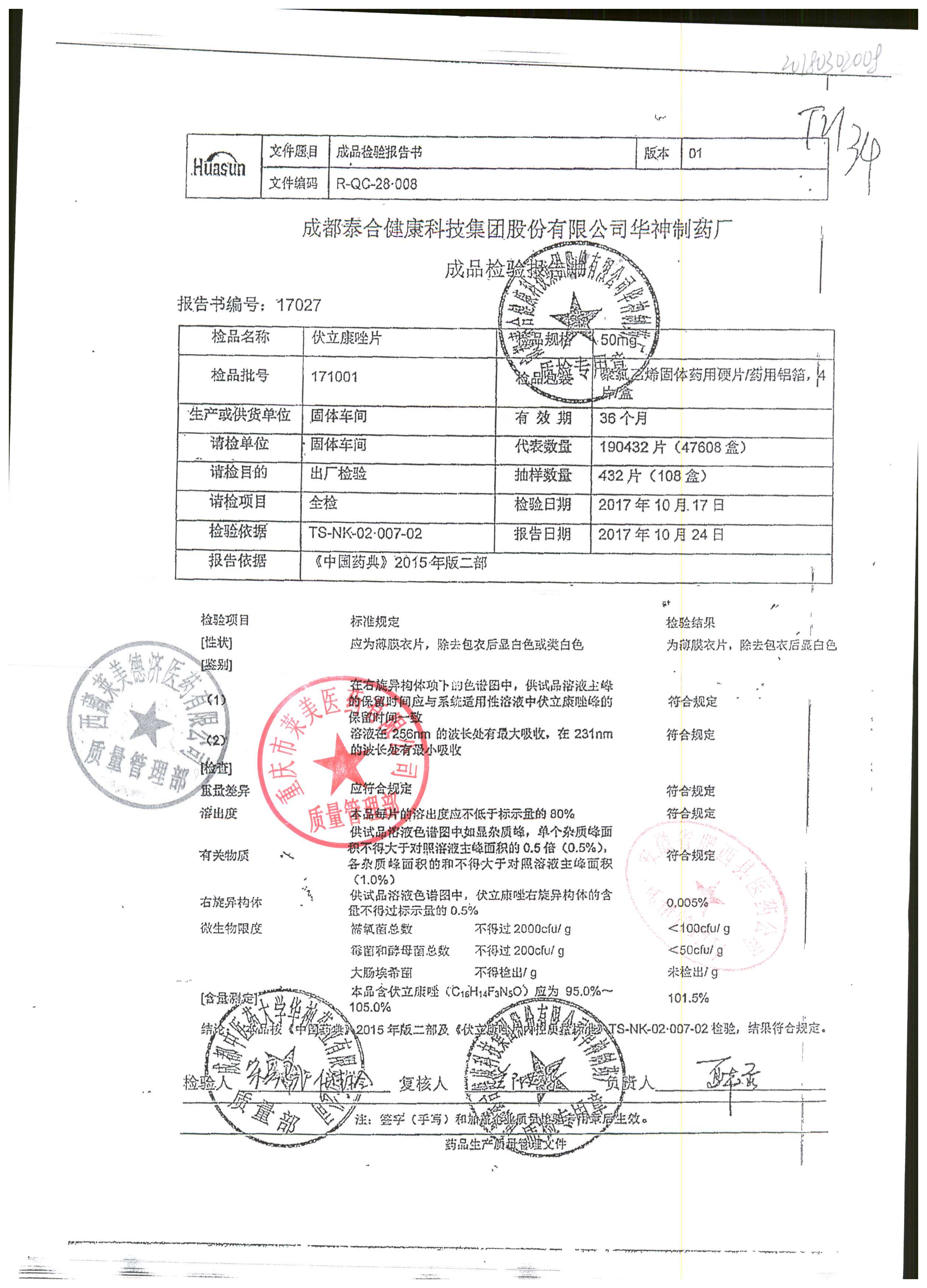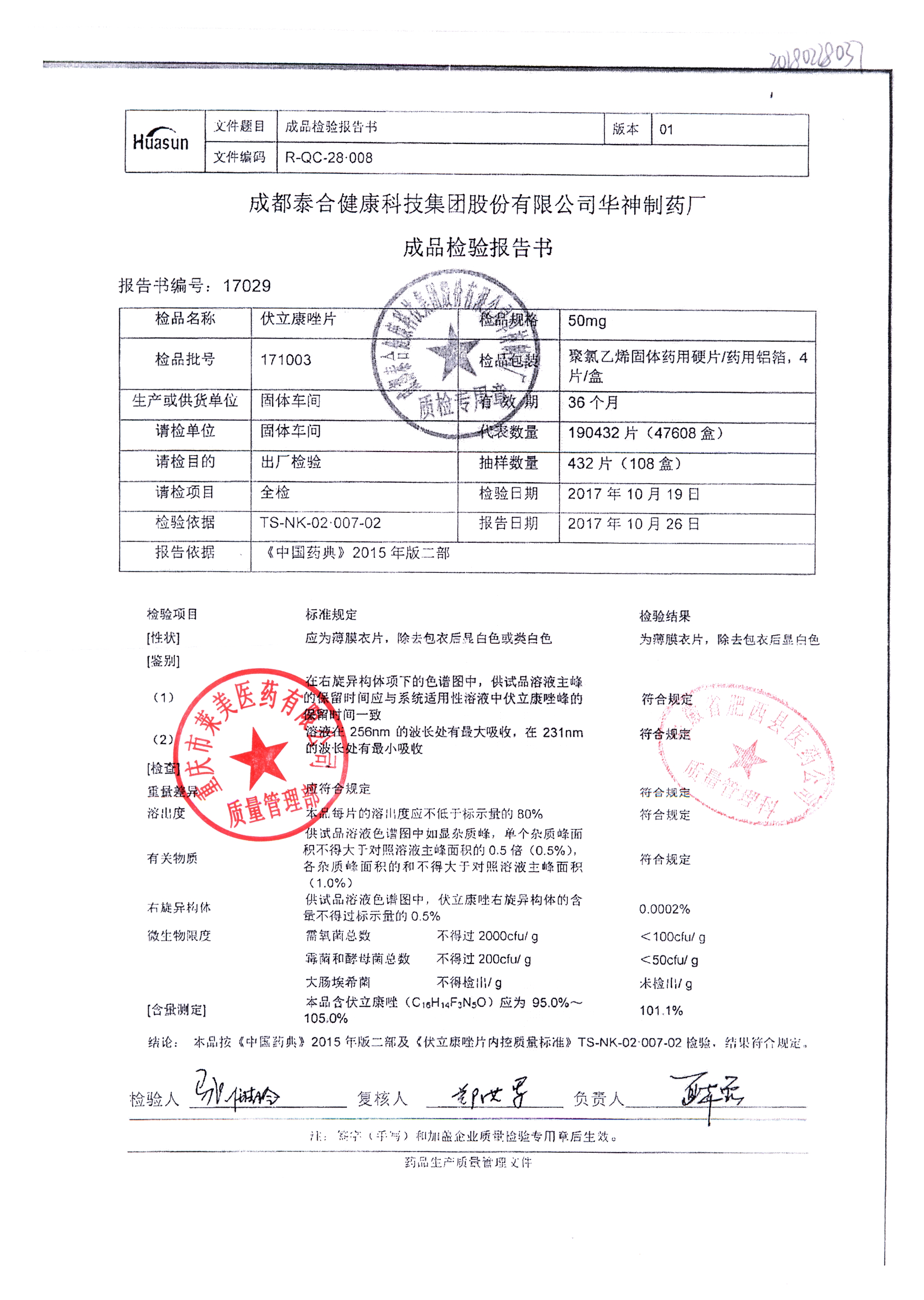 | 伏立康唑片 | 50mg | 171003 | 查看詳情 |
