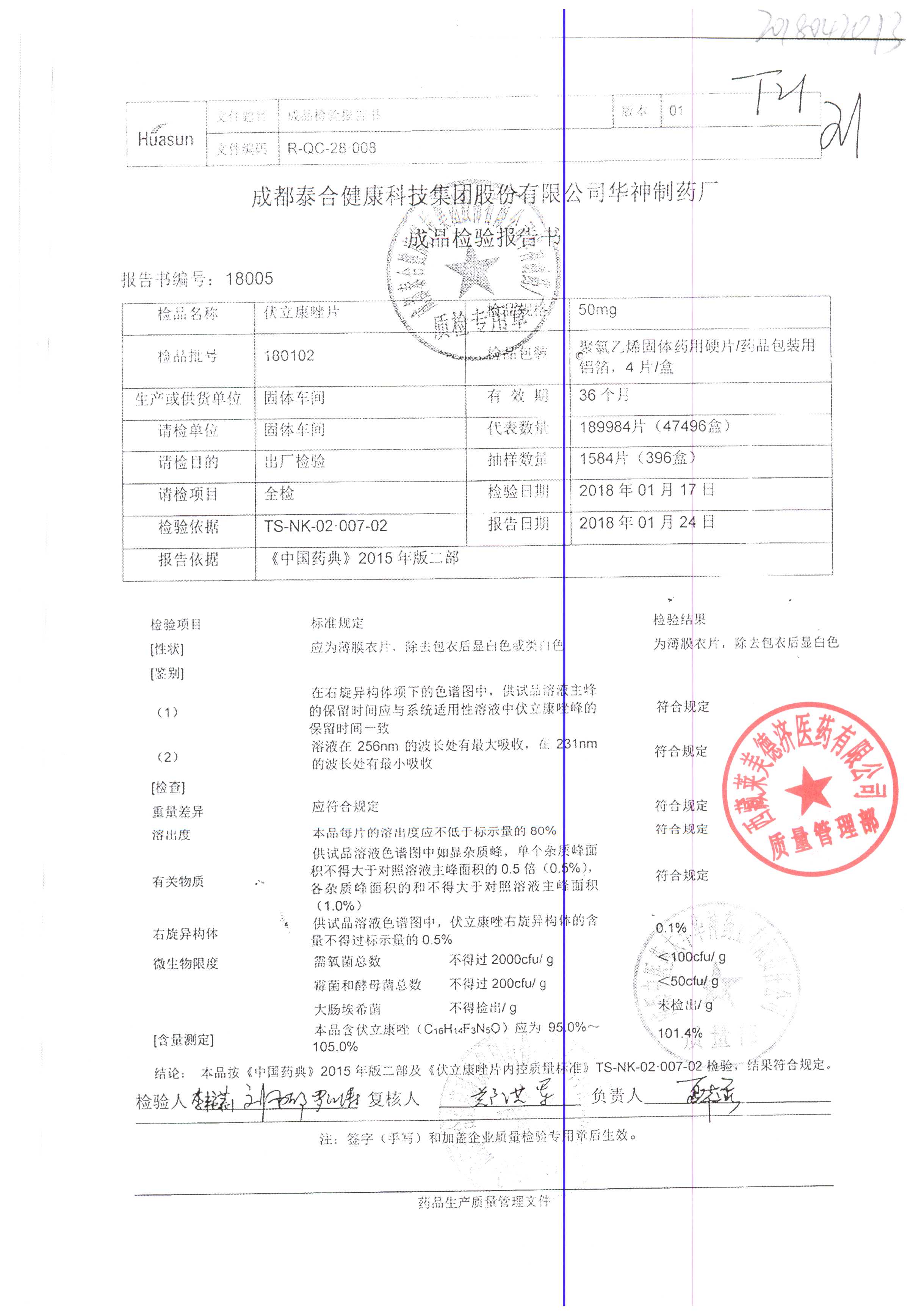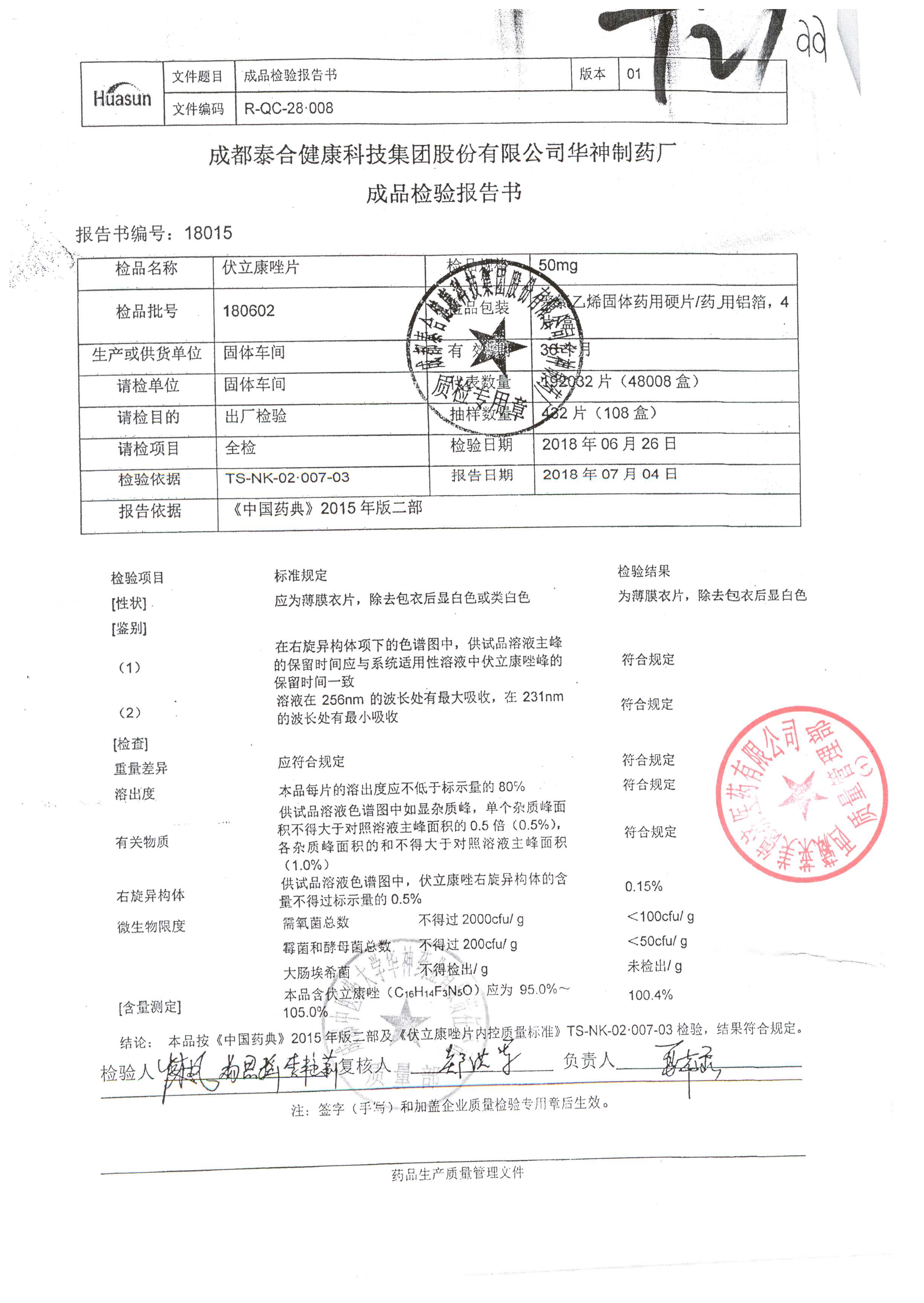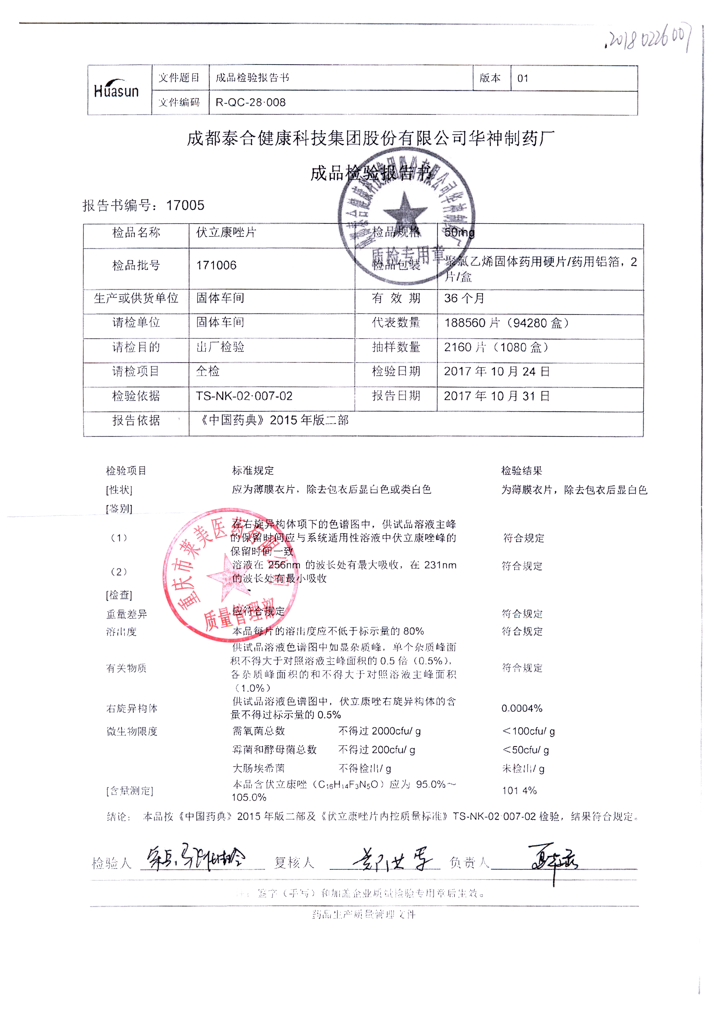 | 伏立康唑片 | 50mg | 180602 | 查看詳情 |