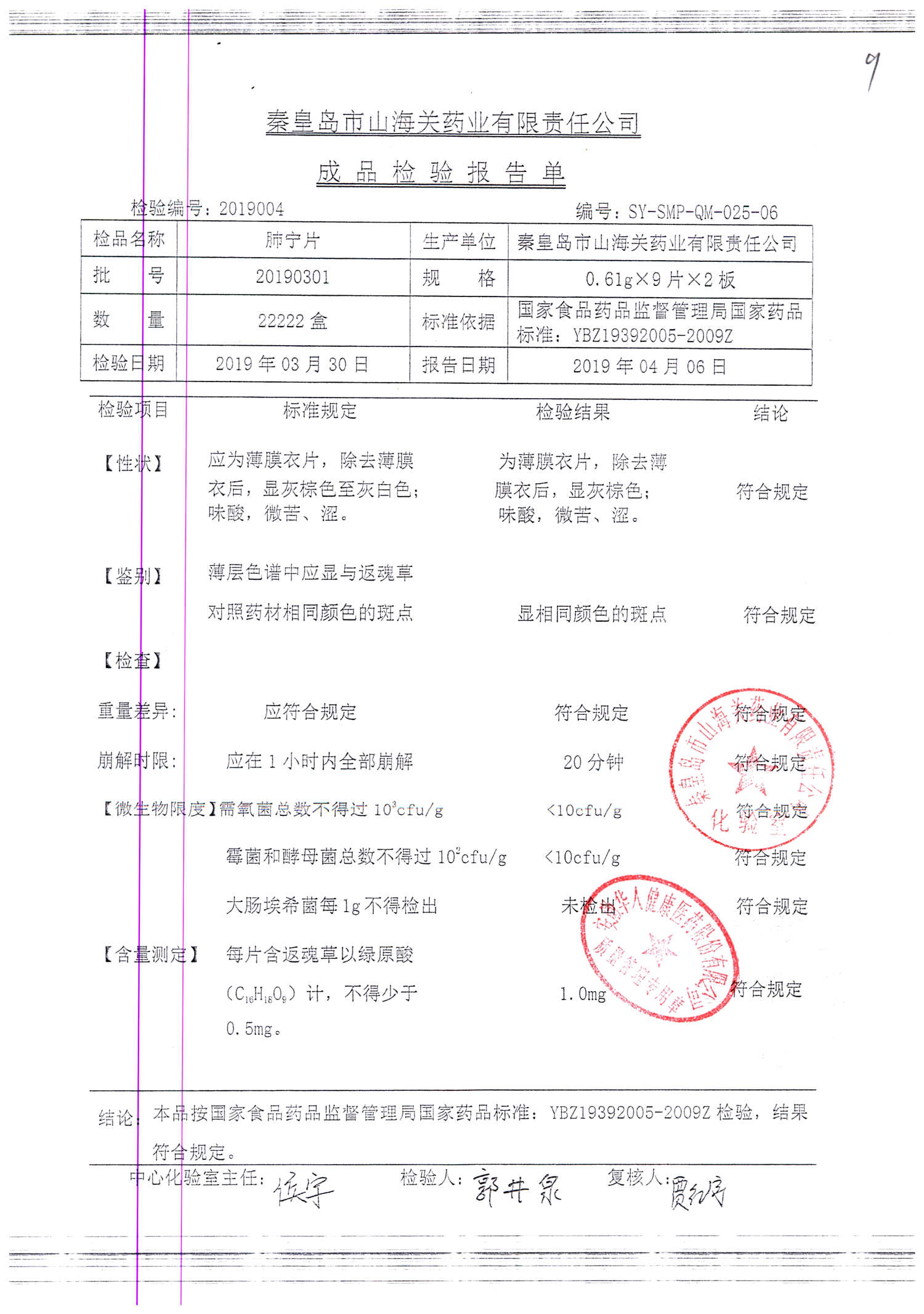 | 肺寧片 | 0.61g*18s | 20190503 | 查看詳情 |