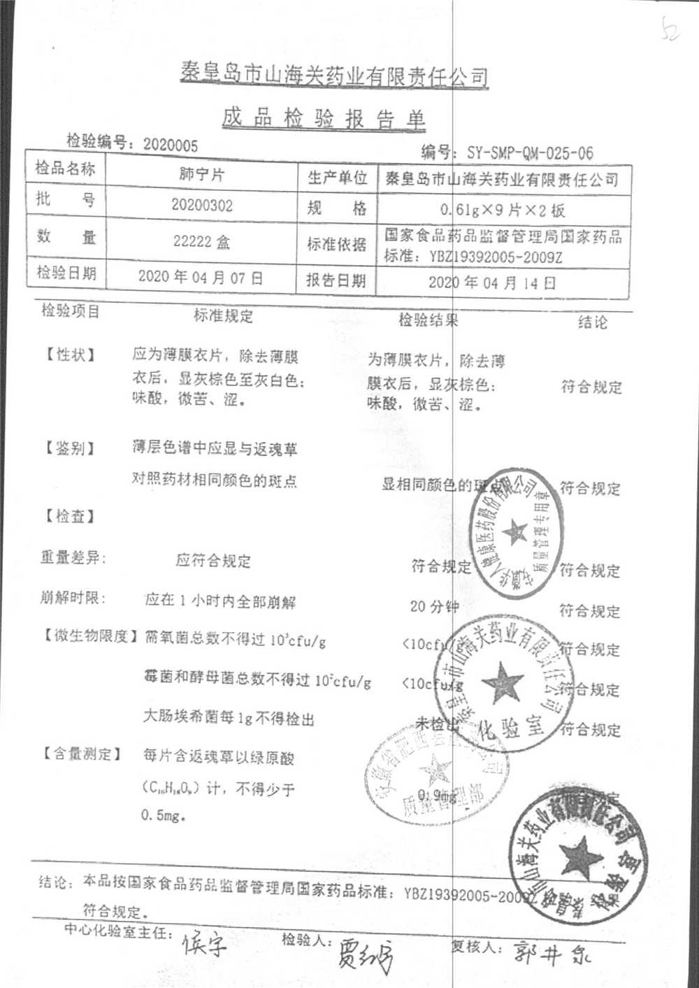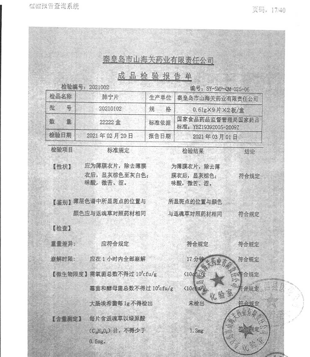 | 肺寧片 | 0.61g*18s | 20210102 | 查看詳情 |
