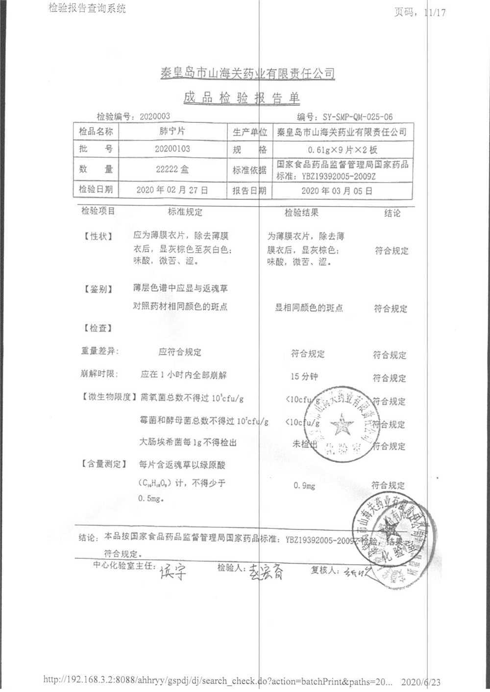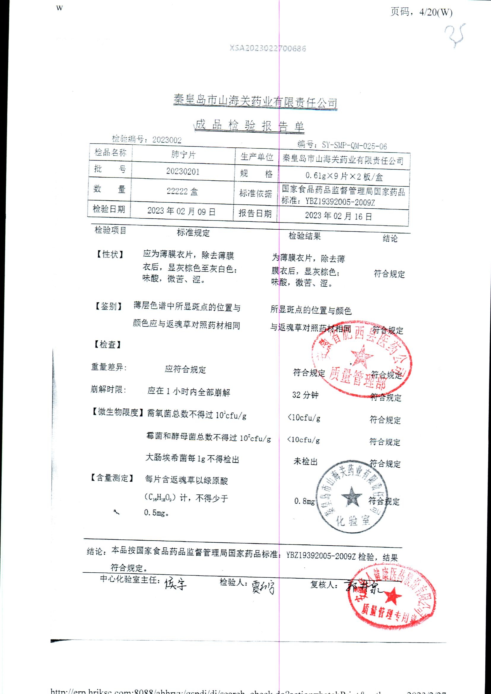 | 肺寧片 | 0.61g*18s | 20200302 | 查看詳情 |