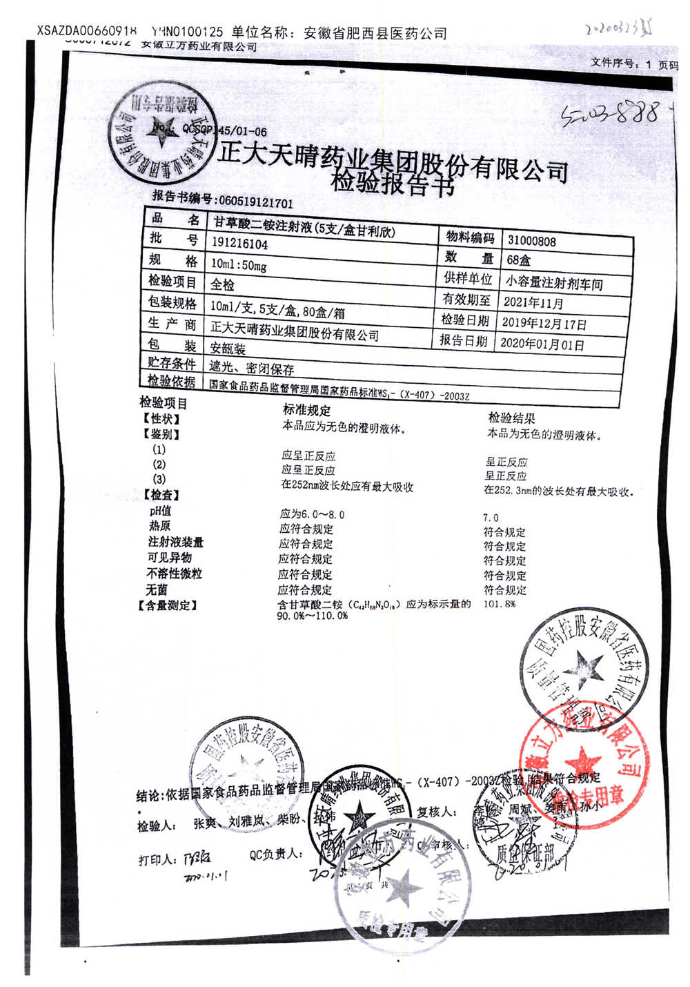 | 甘草酸二胺注射液 | 10ml:50mg | 190218104 | 查看詳情 |