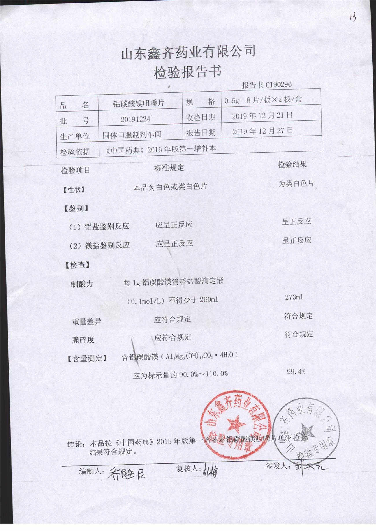 | 鋁碳酸鎂咀嚼片 | 0.5g*16s | 20191224 | 查看詳情 |