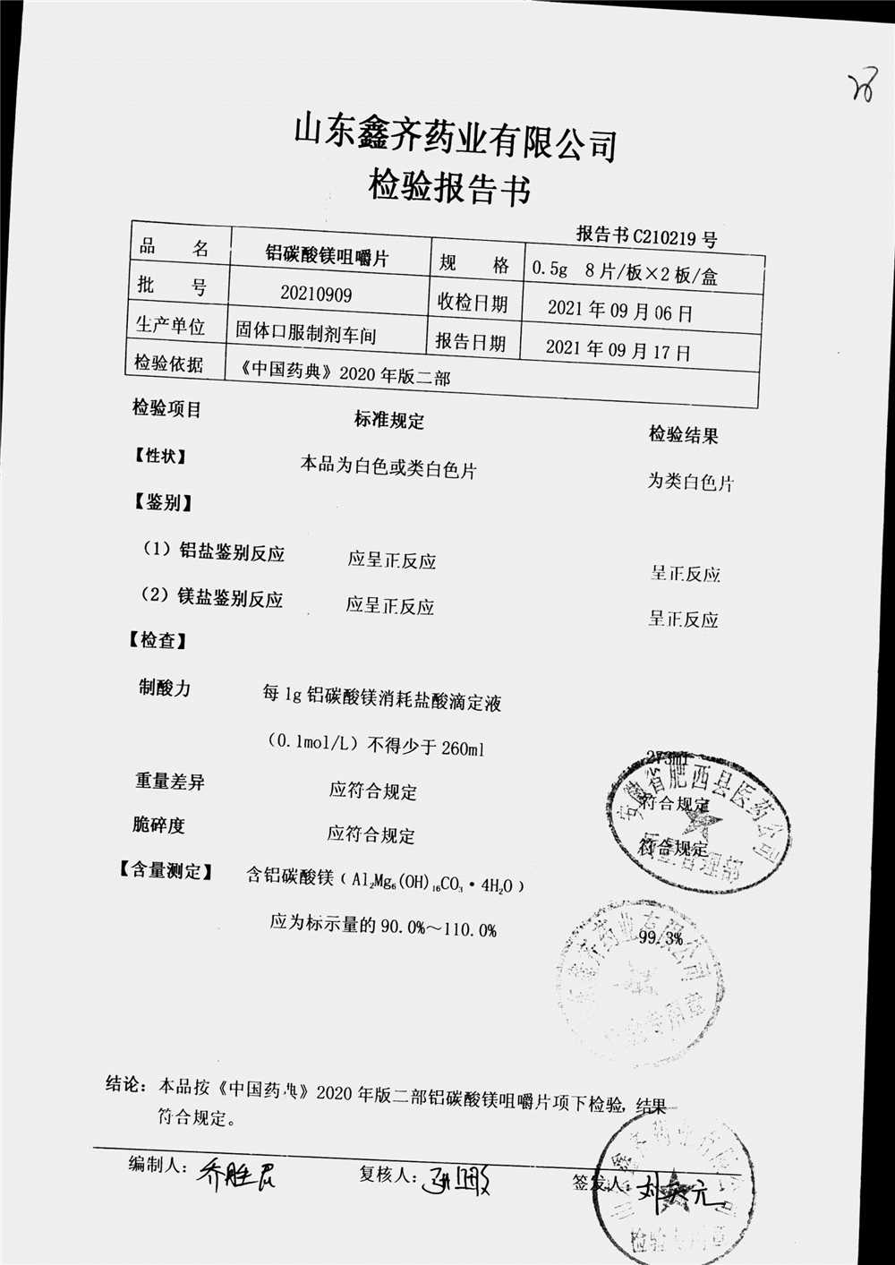 | 鋁碳酸鎂咀嚼片 | 0.5g*16s | 20210909 | 查看詳情 |