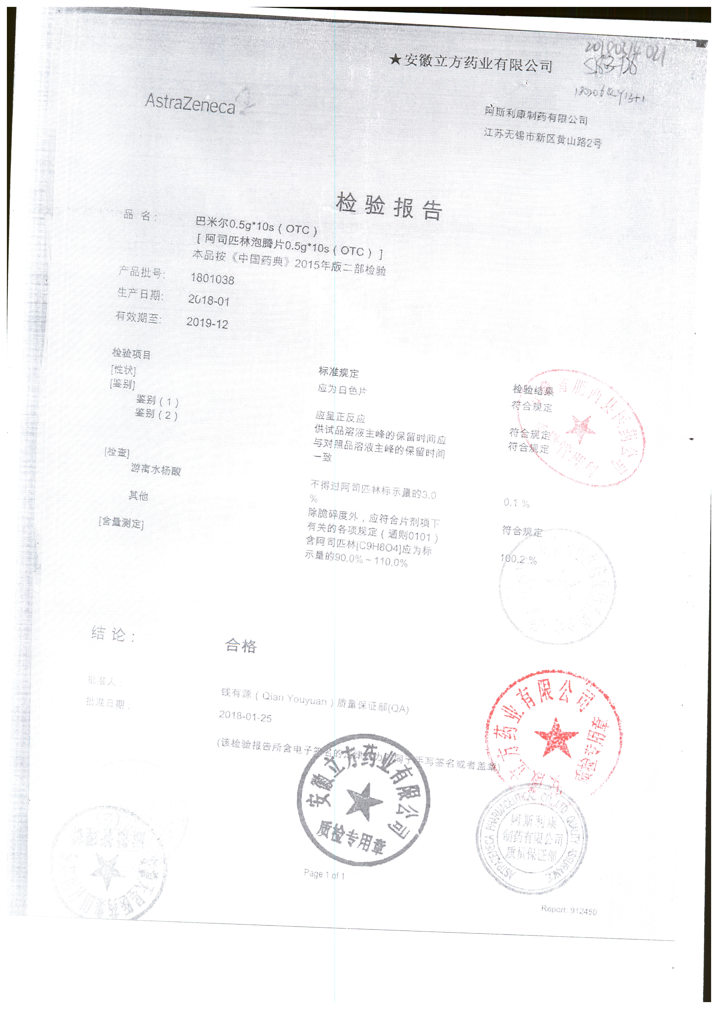 | 阿司匹林腸溶片 | 0.5g*10s | 1801038 | 查看詳情 |